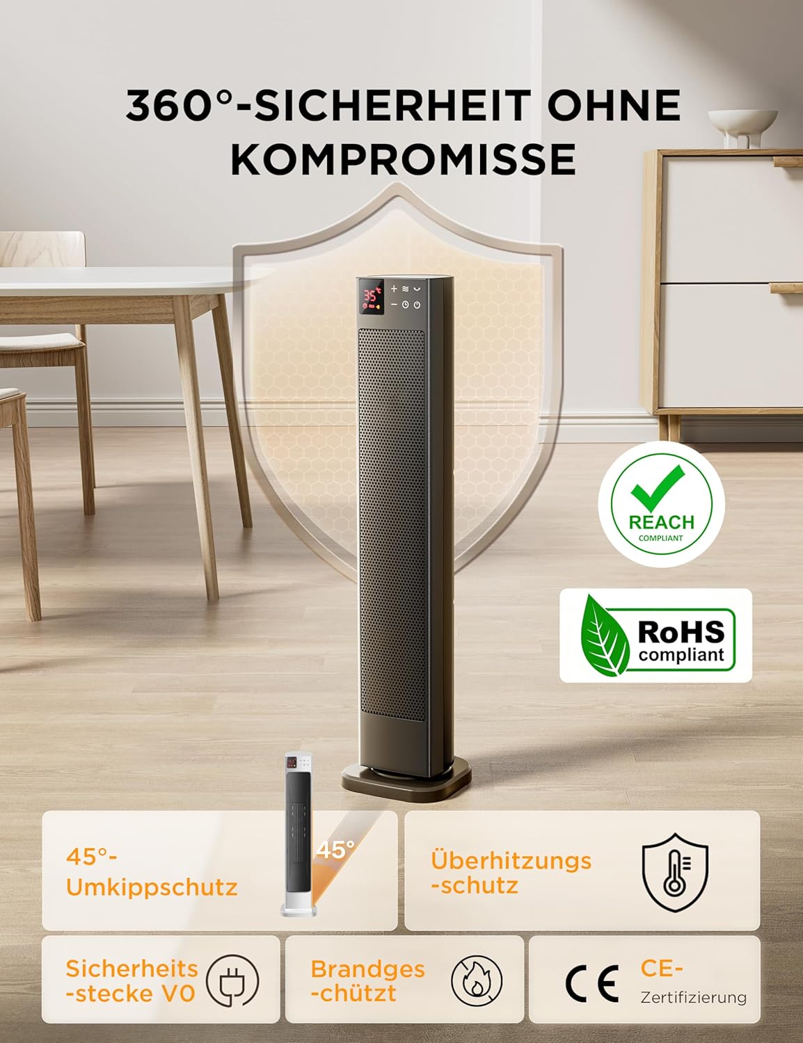 • ПОДОБРЕНИ ФУНКЦИИ ЗА БЕЗОПАСНОСТ За да поставим вашата безопасност на първо място, нашият отоплител е оборудван със защита от накланяне от 45°, материали, забавящи горенето V-0, защита от прегряване и подобрен предпазен щепсел. 24-часовата функция за автоматично изключване осигурява допълнителна безопасност за безпроблемна работа.