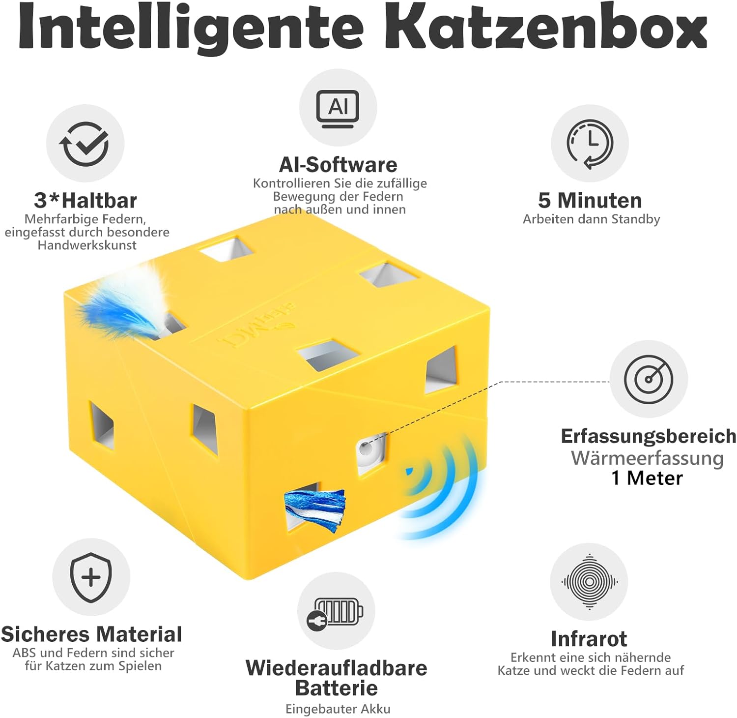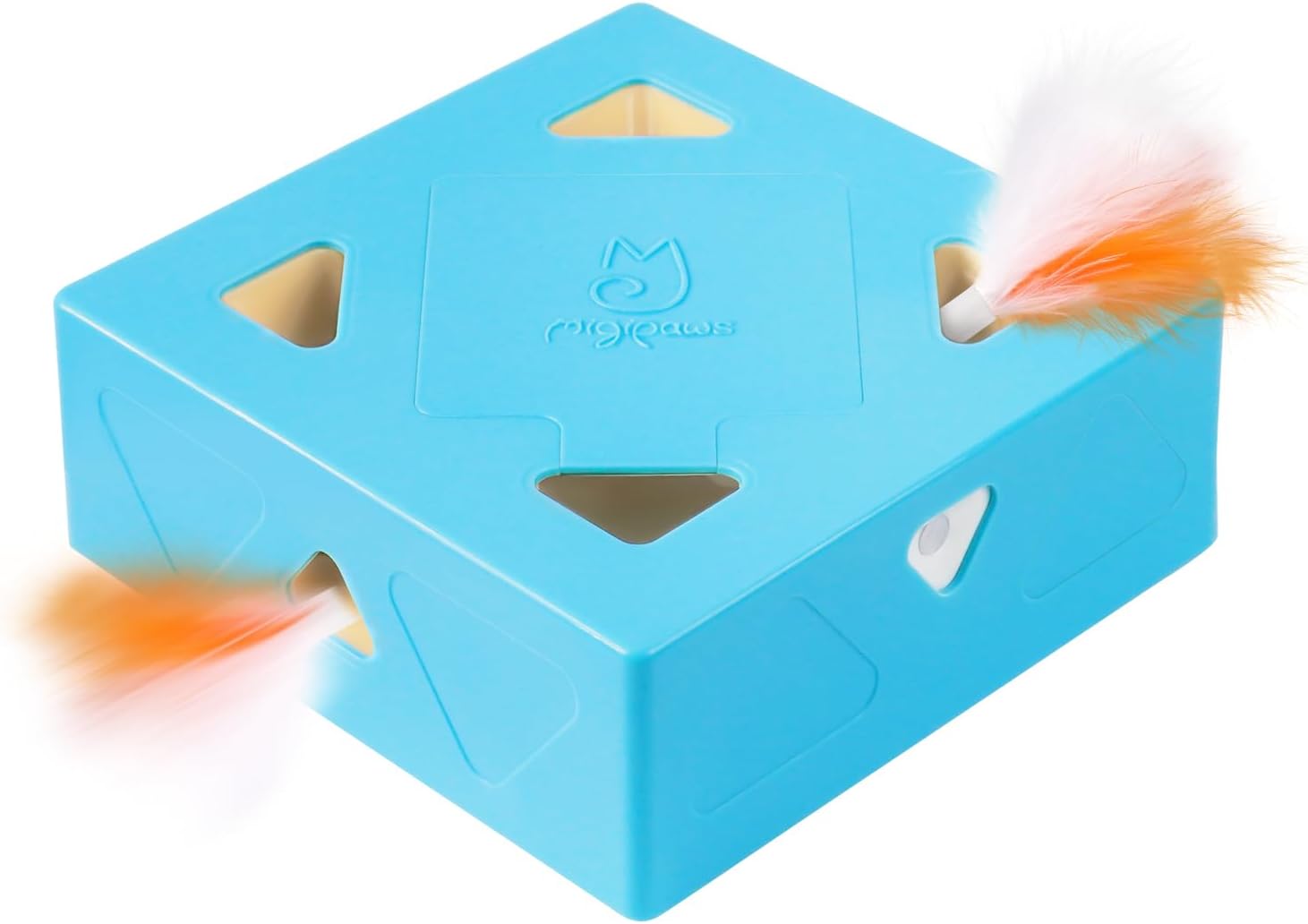 • Иновативно подобрение 3 в 1: лов на пера, плюшена изненада, картонена кутия за ровене. Подобрението от 2025 г. на интерактивната играчка за котки MigiBox предлага три индивидуални сценария за игра, задоволява любопитството и ловния инстинкт на котките и осигурява безкрайно забавление за домашните котки.