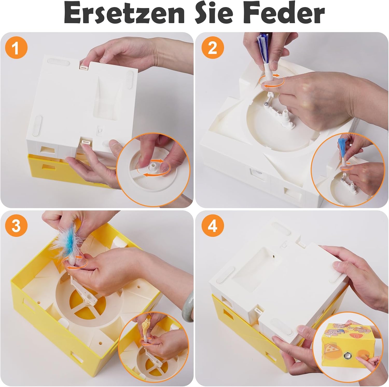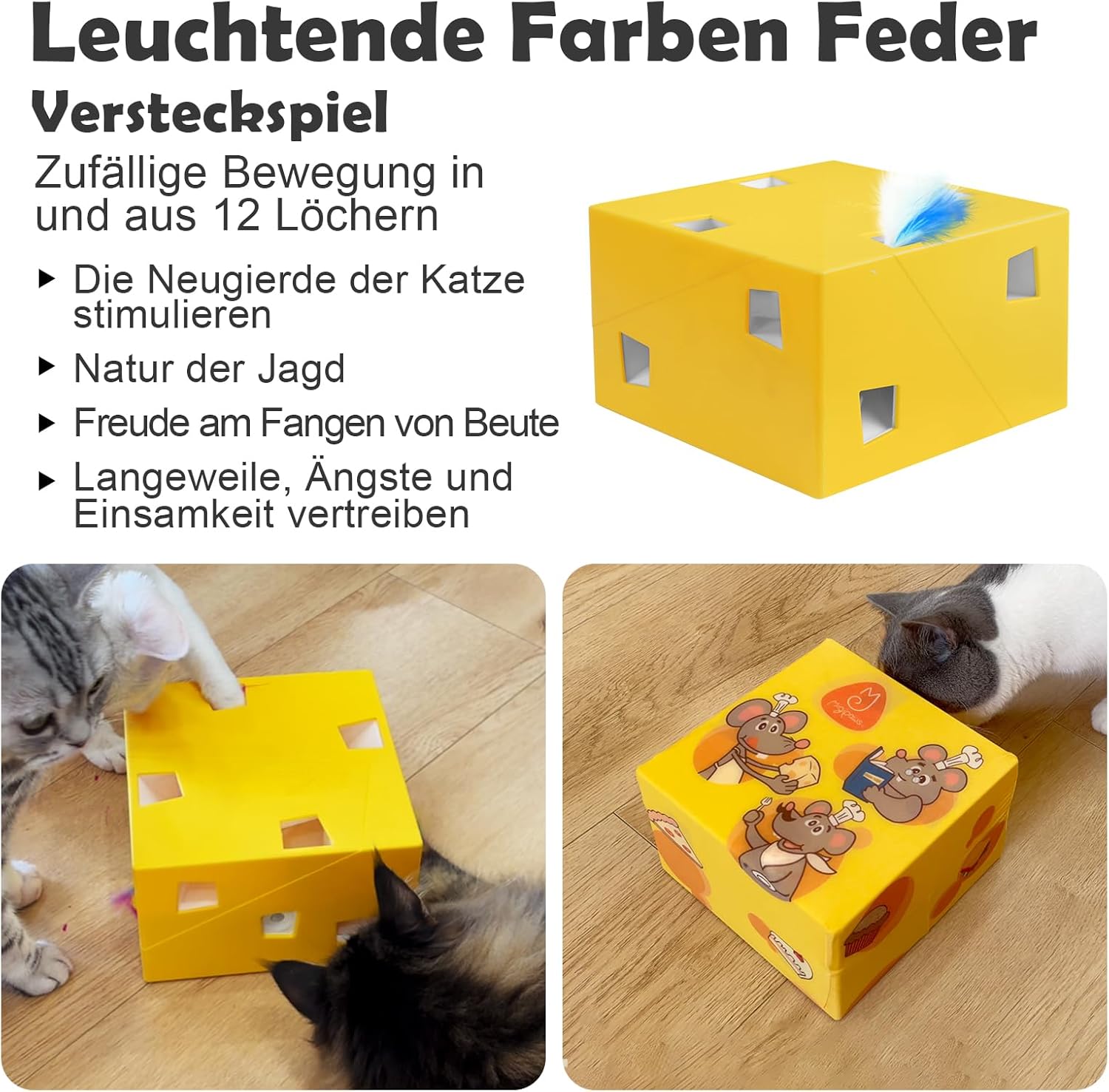 • Случайно движение, чиста ловна треска: Перото изскача произволно от 4-те дупки отгоре и 8-те дупки отстрани на характерната кубична архитектура и стимулира котките да мислят, наблюдават и удрят. Котките се обсебват от тези интелигентни ловни игри, за да облекчат депресията, скуката, тревожността и самотата. Не се притеснявайте, ако имате срамежлива, чувствителна котка, тя може да я гледа с часове и след това внезапно да се хвърли върху нея.