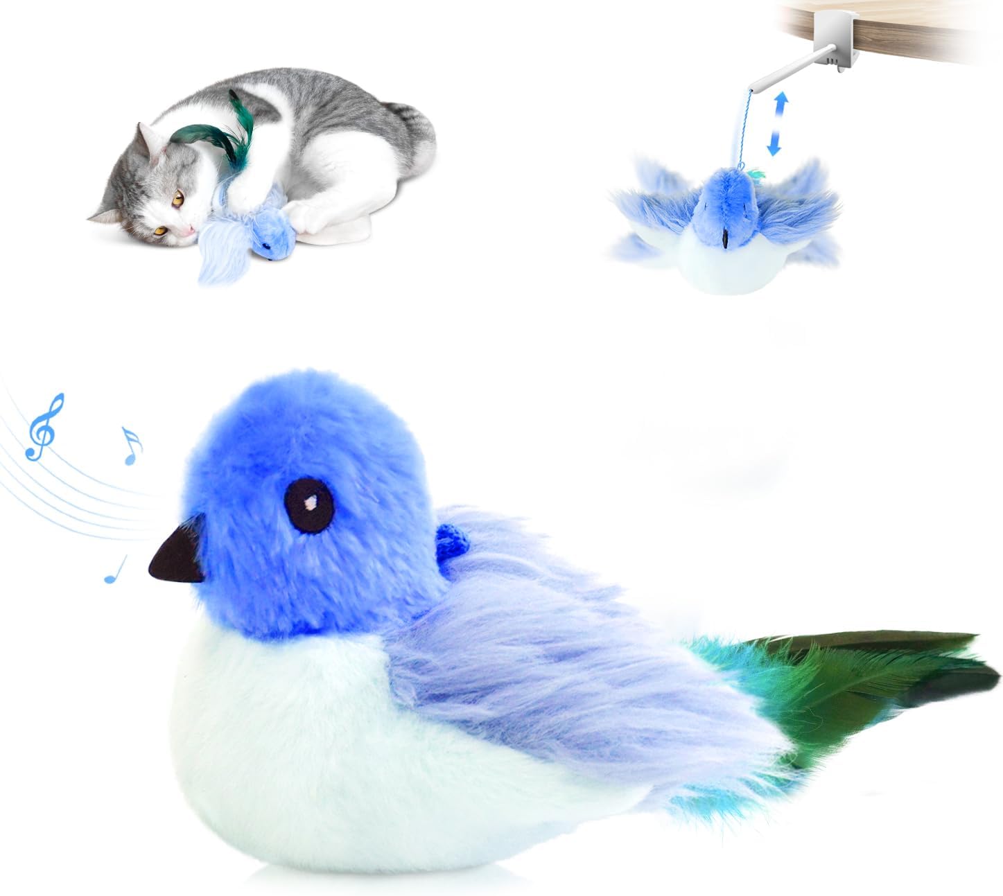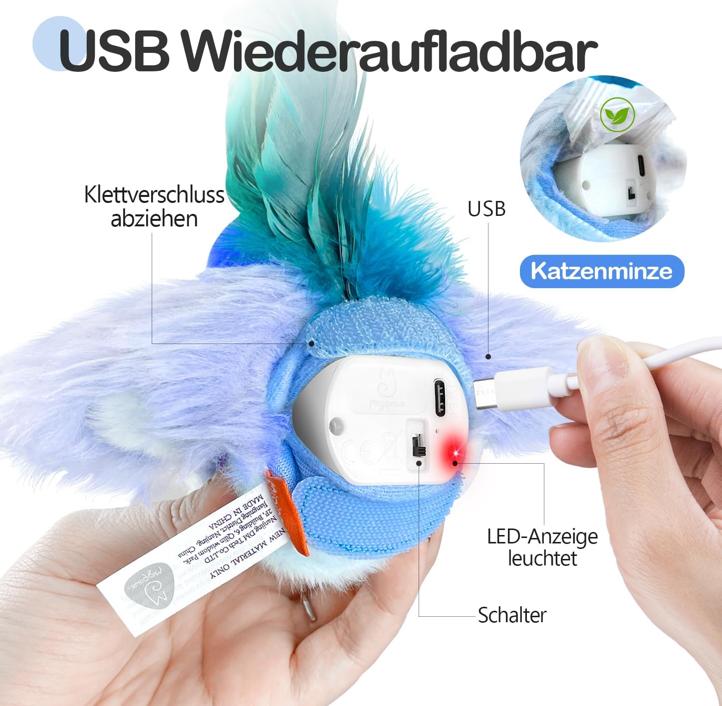 Migipaws Котешка играчка, Електрическа интерактивна котешка играчка, Истинско пърхане и чуруликане като птица, Плюшена играчка с котешка трева, Презареждаща се (Синя)