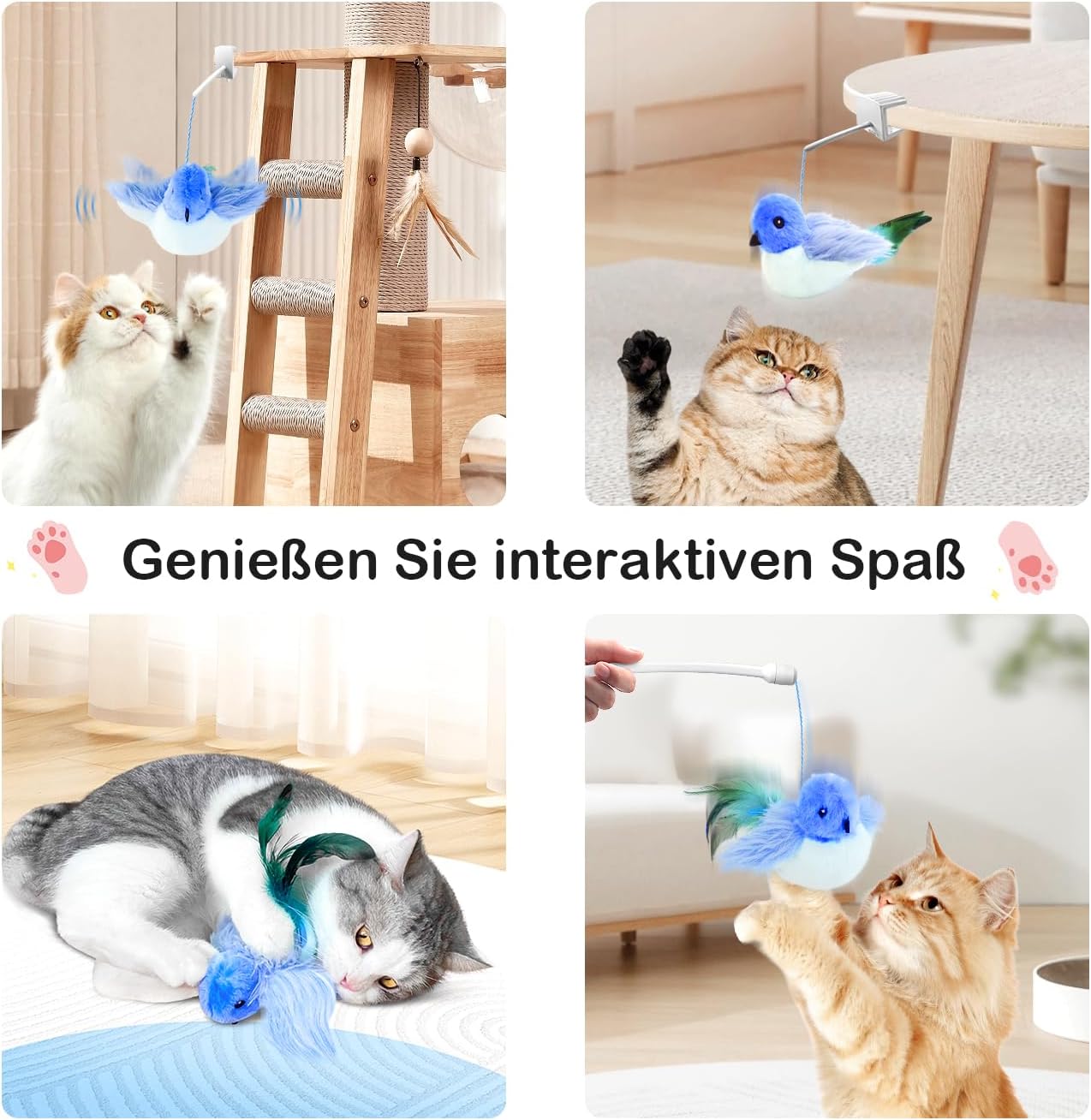 • Интерактивно забавление за котки и хора: Благодарение на практичния си дизайн с примка на гърба, тази играчка може лесно да се прикрепи към въдица за котки (не е включена). Когато собственикът държи въдицата и я люлее нагоре и надолу, птицата пърха като истинска птица и привлича котките към интерактивна игра. Това ви позволява да заздравите връзката между котките и техните човешки спътници по забавен начин.