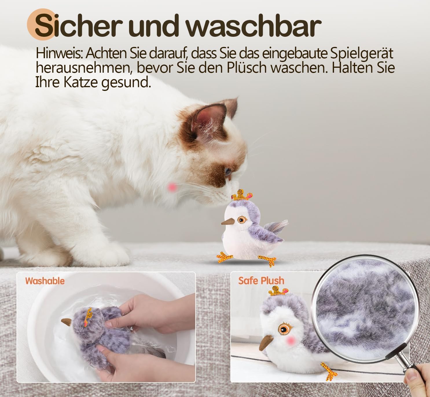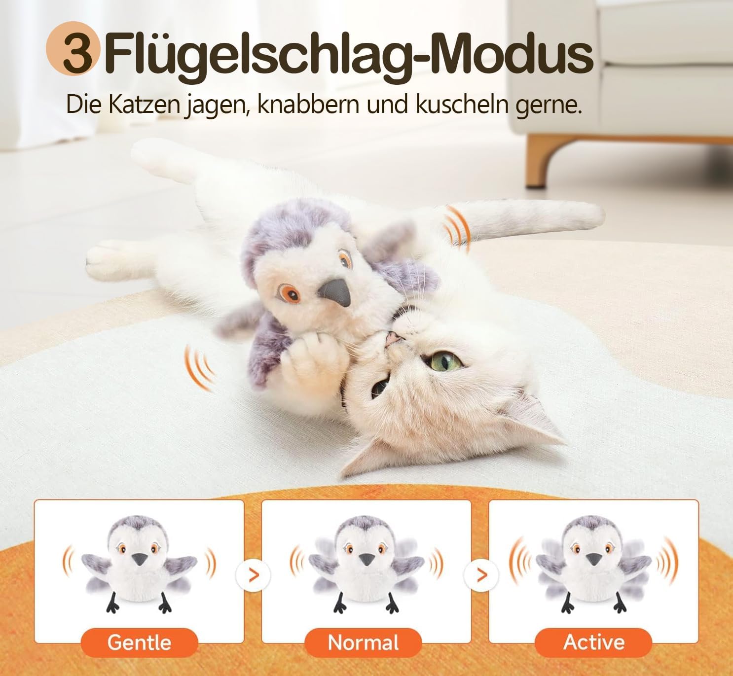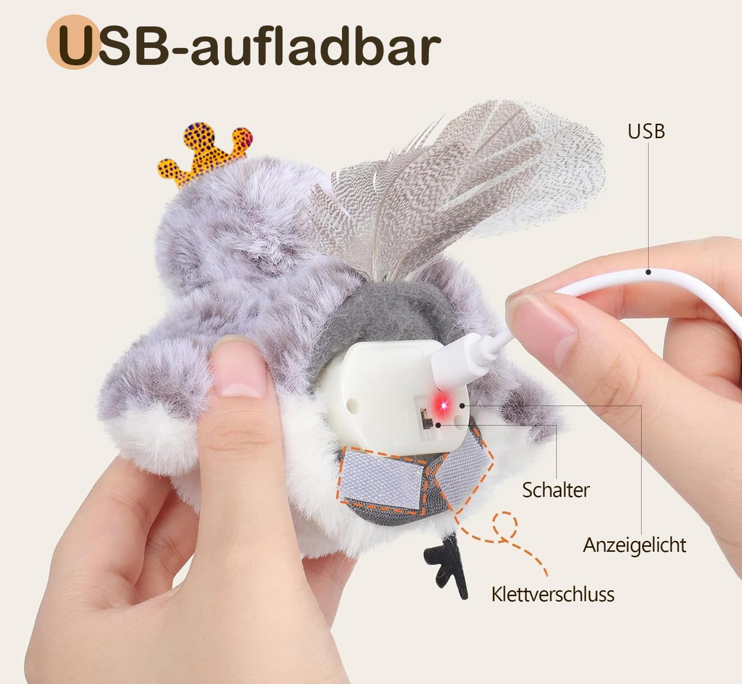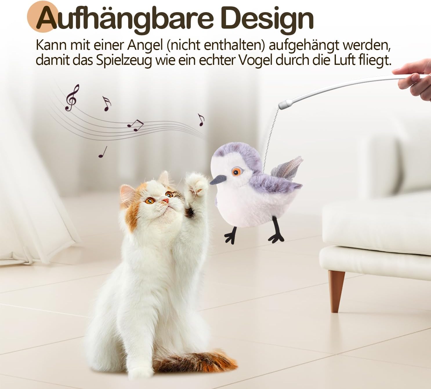 • Интерактивно забавление за котки и хора: Благодарение на практичния си дизайн с примка на гърба, тази играчка може лесно да се прикрепи към въдица за котки (не е включена). Когато собственикът държи въдицата и я люлее нагоре и надолу, птицата пърха като истинска птица и привлича котките към интерактивна игра. Това ви позволява да заздравите връзката между котките и техните човешки спътници по забавен начин.
