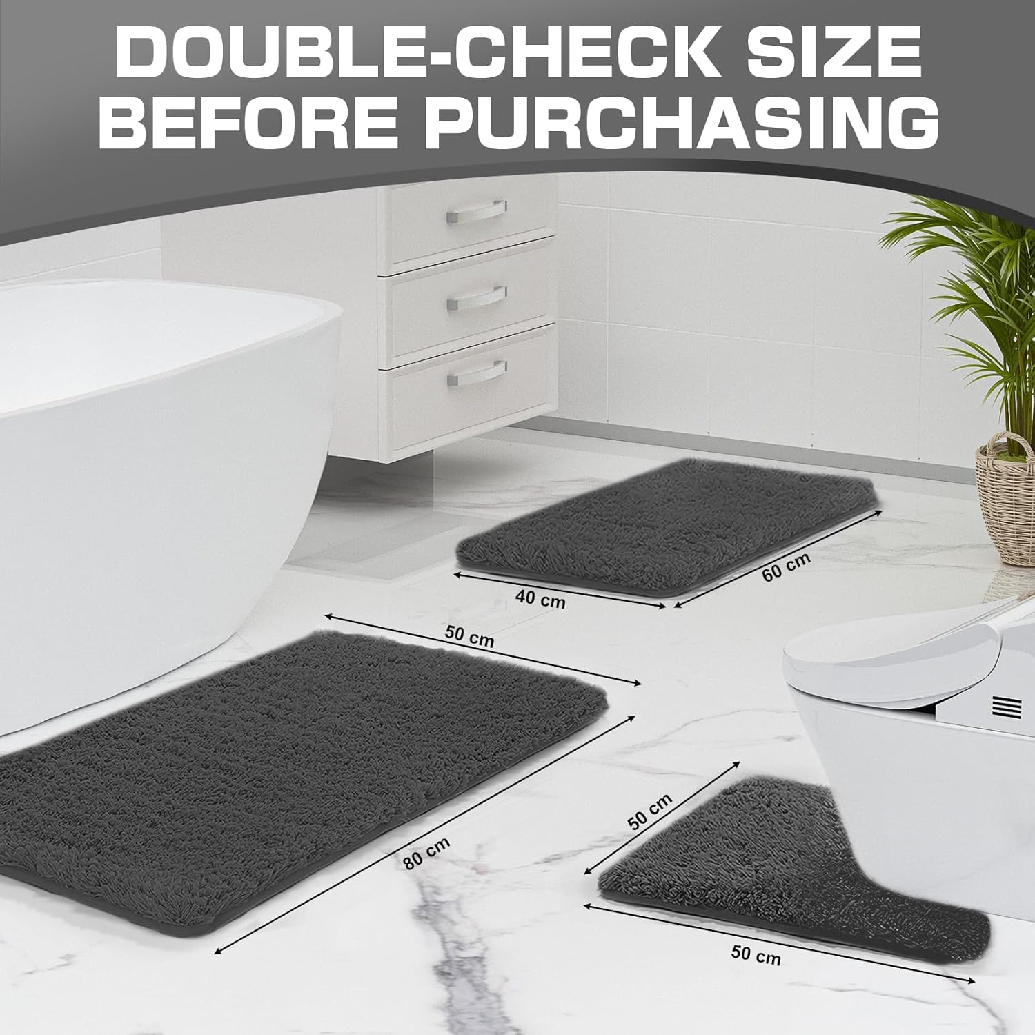 • Налични размери: изберете от 40 x 60 см, 50 x 80 см, 50 x 50 U-образна форма и подходяща. Нашата постелка за баня пасва идеално на всяка баня и ви осигурява достатъчно покритие.