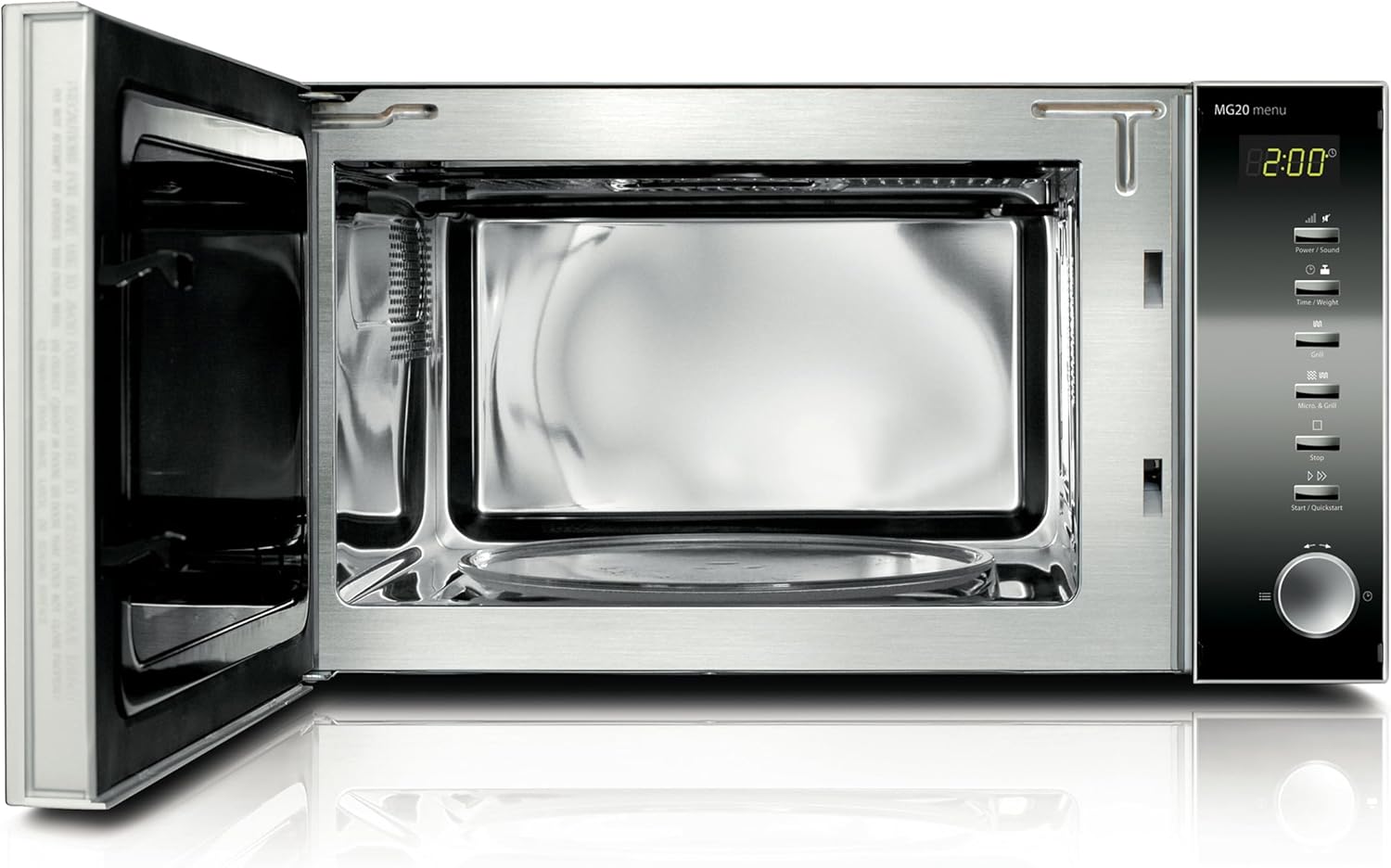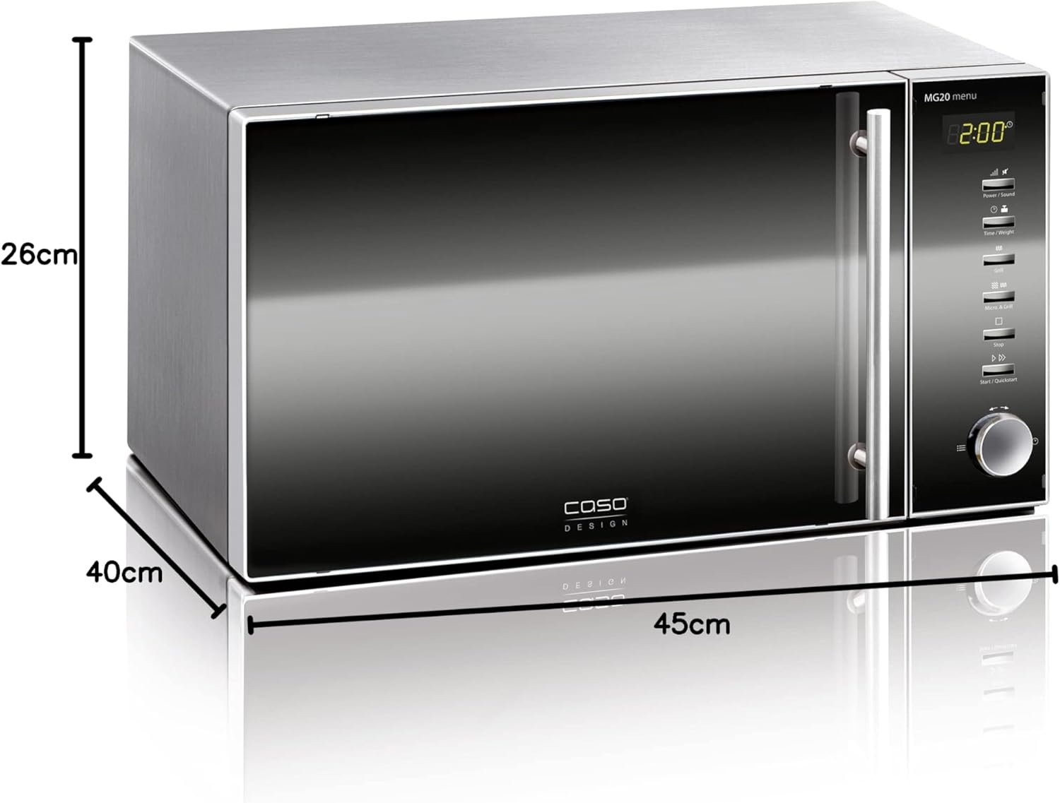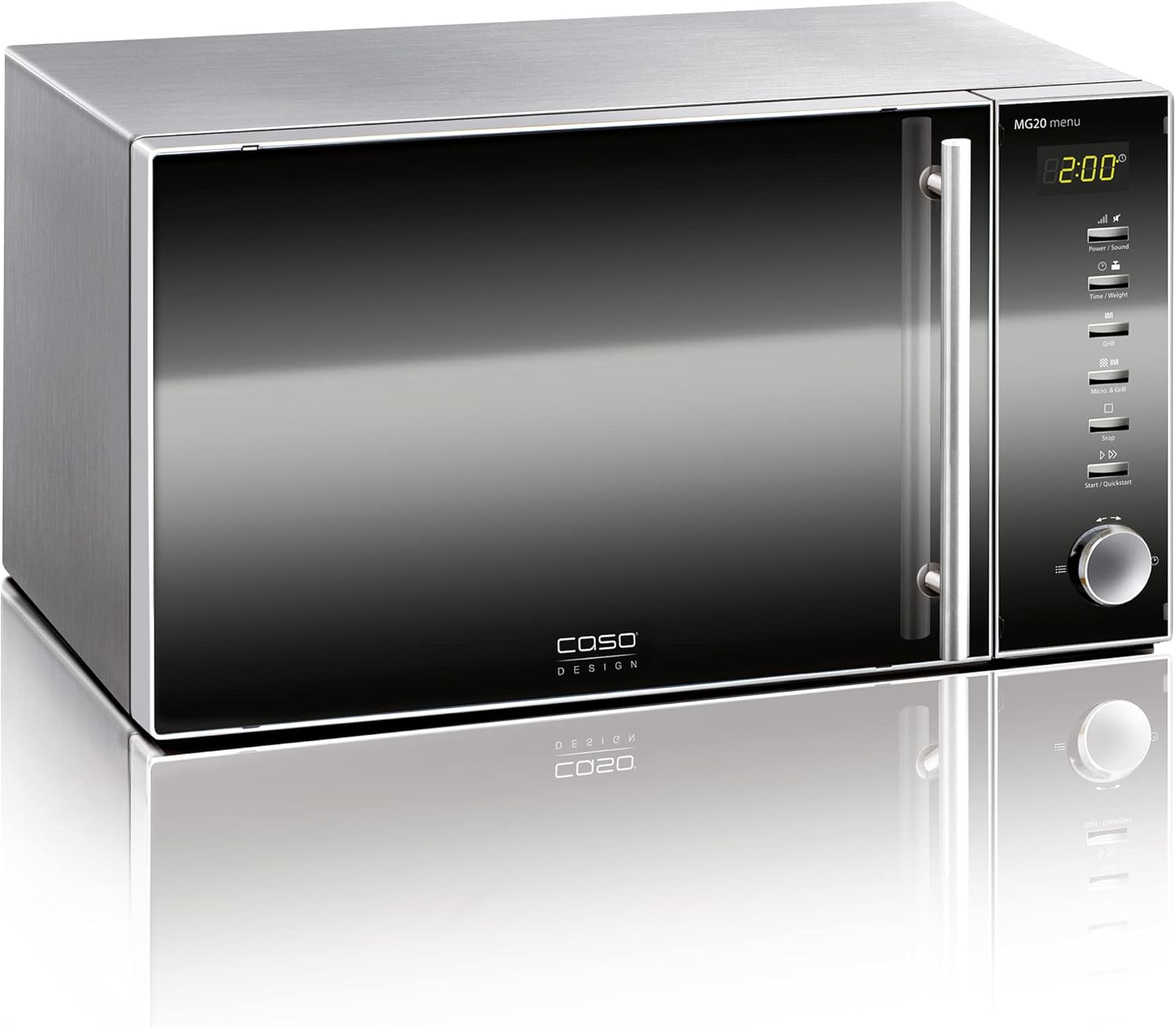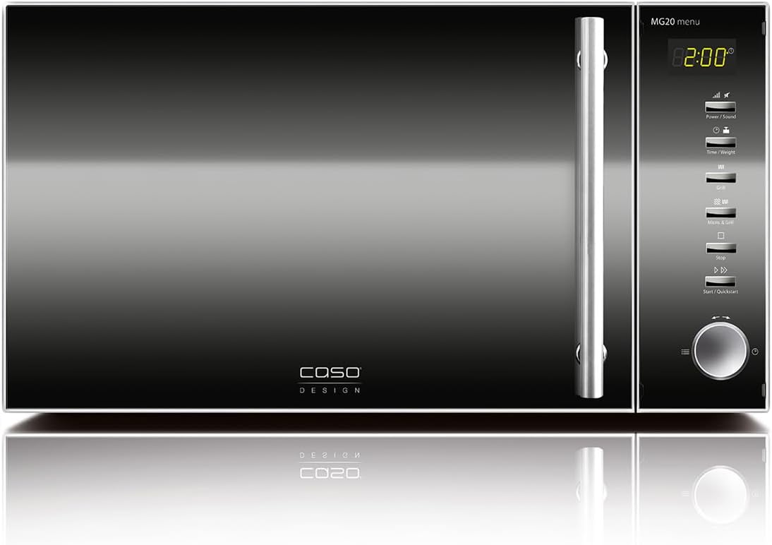 Микровълнова фурна Caso MG20 menu 2 в 1 с грил 800 W, грил 1000 W, 2 комбинирани програми + 14 програми за готвене, дизайн от неръждаема стомана и огледало, 20 л, неръждаема стомана