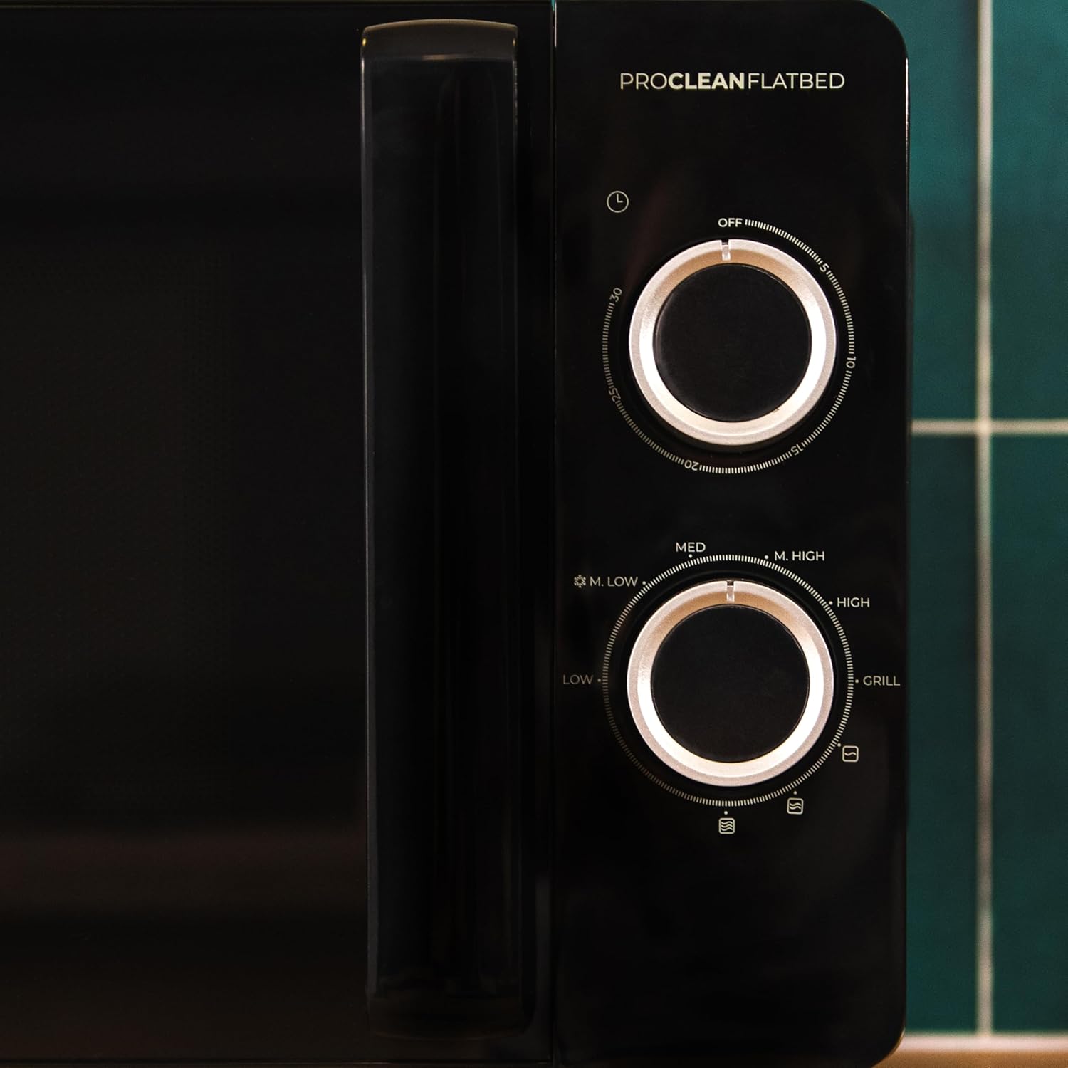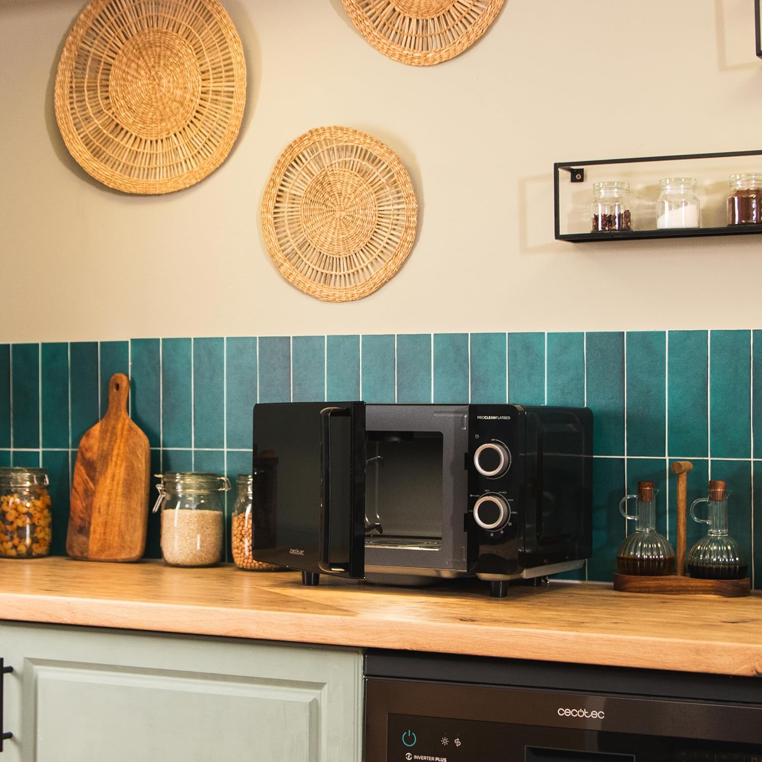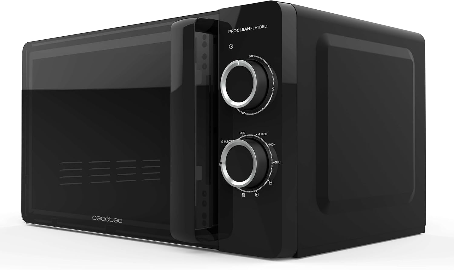 Микровълнова фурна Cecotec Proclean 3130 с плоска основа и грил, 20 л, 700 W, капацитет 6 нива, 800 W грил, бързо и златисто готвене, дизайн FullCrystal и 3DWave технология за ефективно готвене.