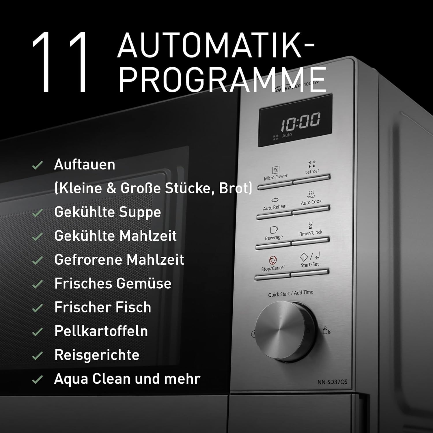 • 11 АВТОМАТИЧНИ ПРОГРАМИ: опростено готвене с 11 предварително зададени режима на готвене на тази микровълнова фурна с грил, които осигуряват прецизни настройки за супа, зеленчуци, риба, ориз и други.