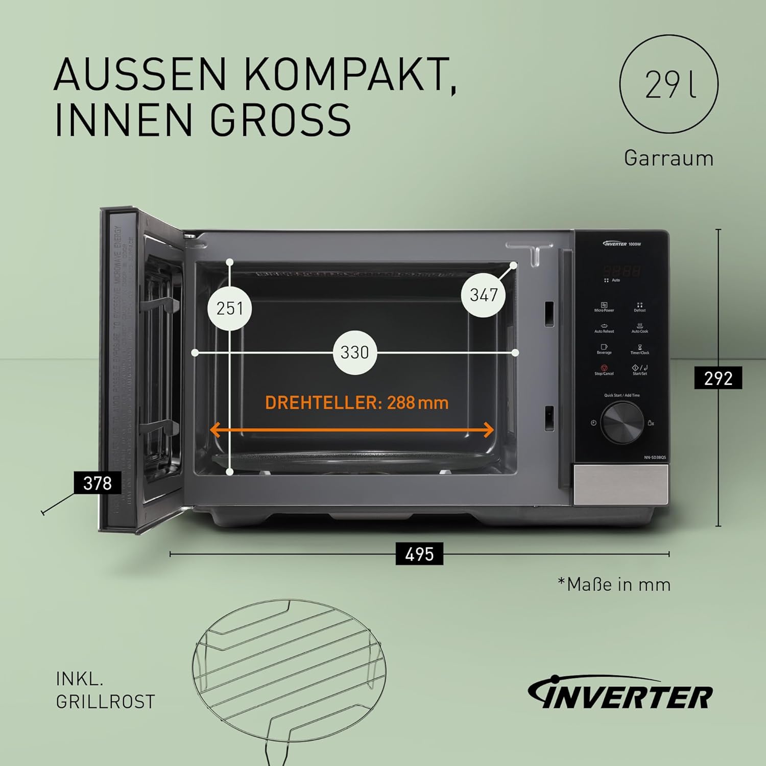 • КОМПАКТЕН ПРЕМИУМ ДИЗАЙН Спестете място с елегантния, минималистичен дизайн на тази 29-литрова премиум микровълнова фурна, идеална за големи съдове