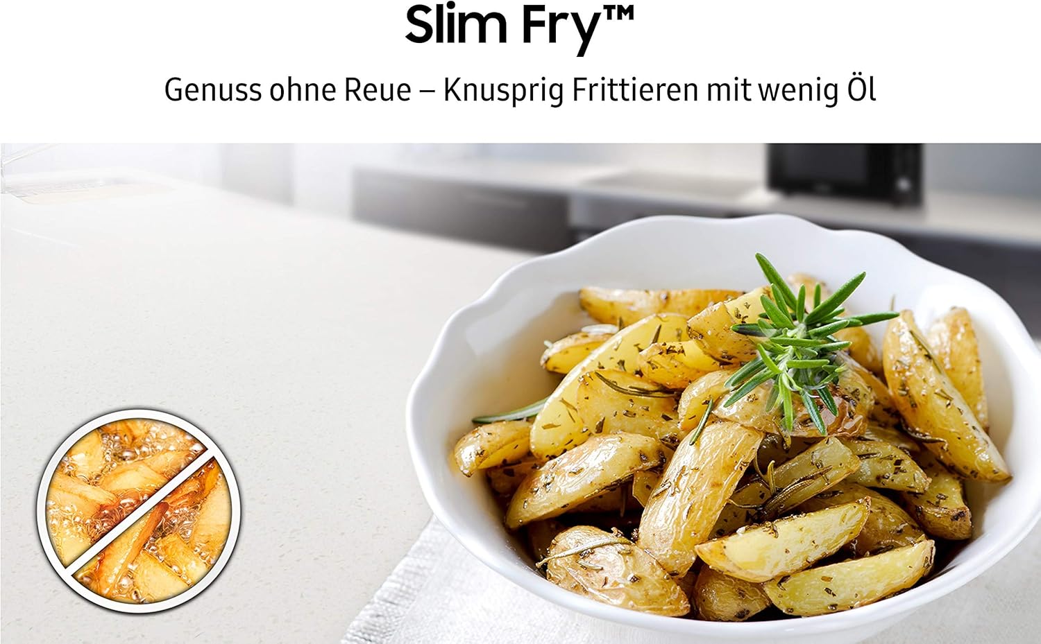 • Samsung Slim Fry предлага пържене на храна с комбинация от микровълнова фурна, грил и функция за горещ въздух. Този усъвършенстван процес, заедно с хрупкавата плоча, осигурява оптимални резултати при пържене почти без олио. Можете да видите и опитате разликата!