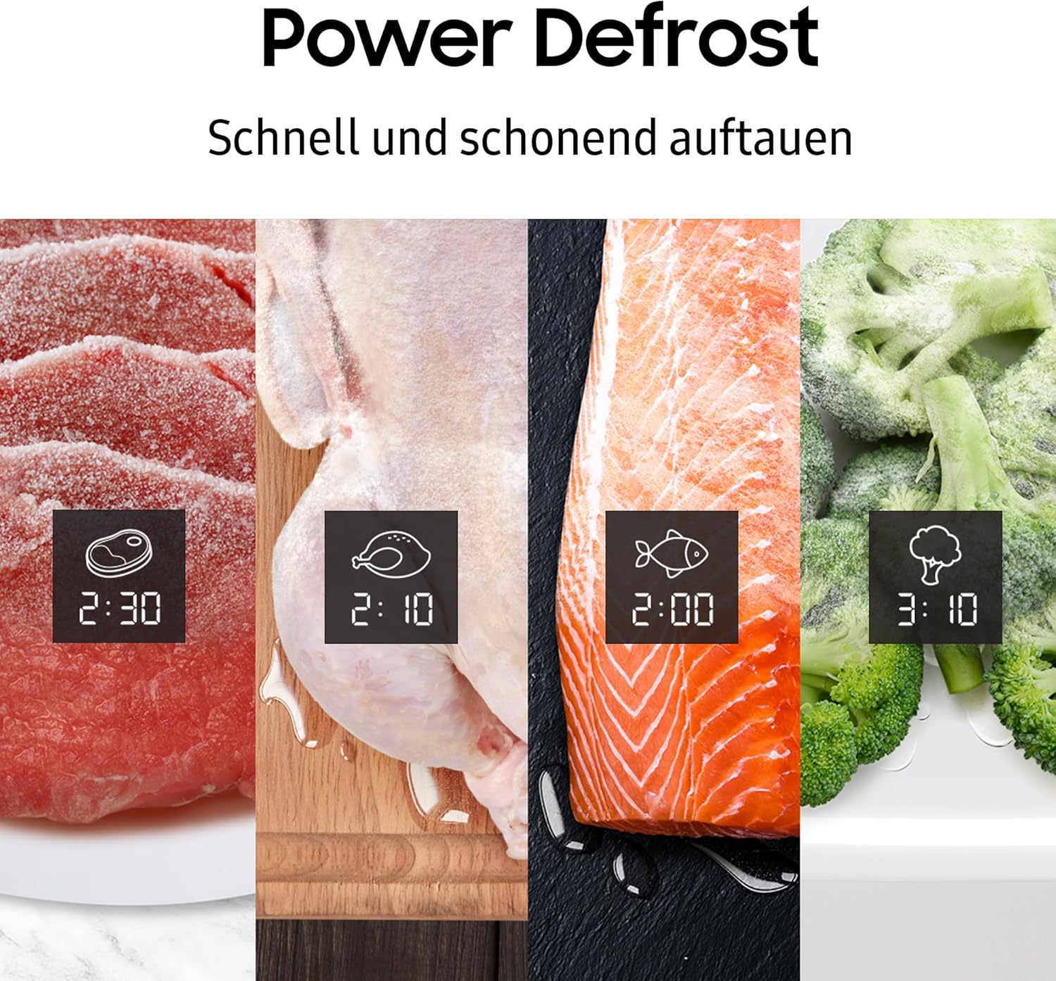 • Лесно размразяване: програмите за размразяване позволяват бързо и равномерно размразяване на храната, запазвайки първоначалната ѝ свежест и консистенция.