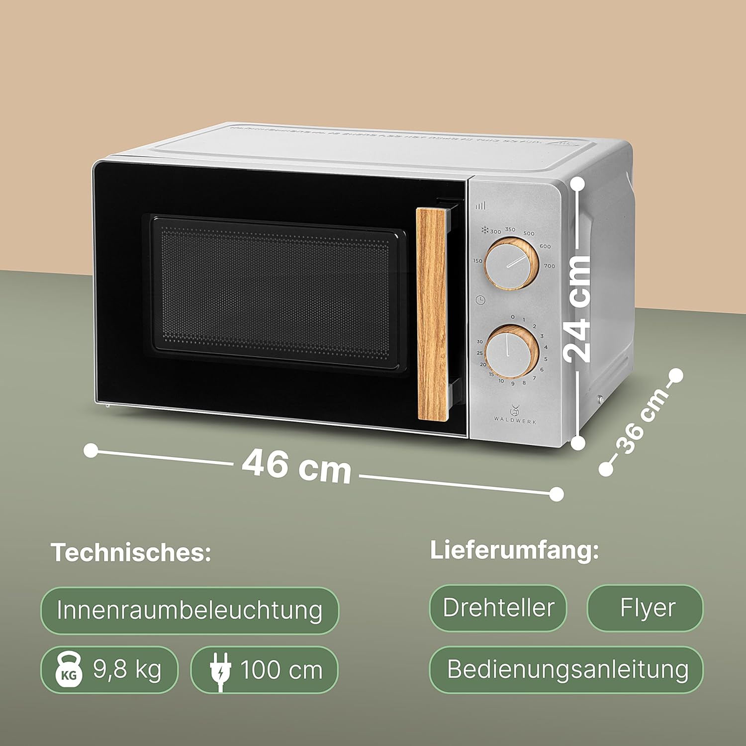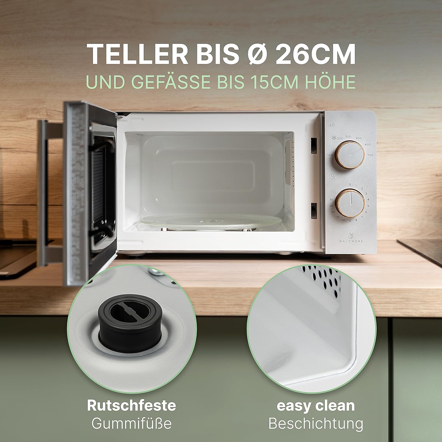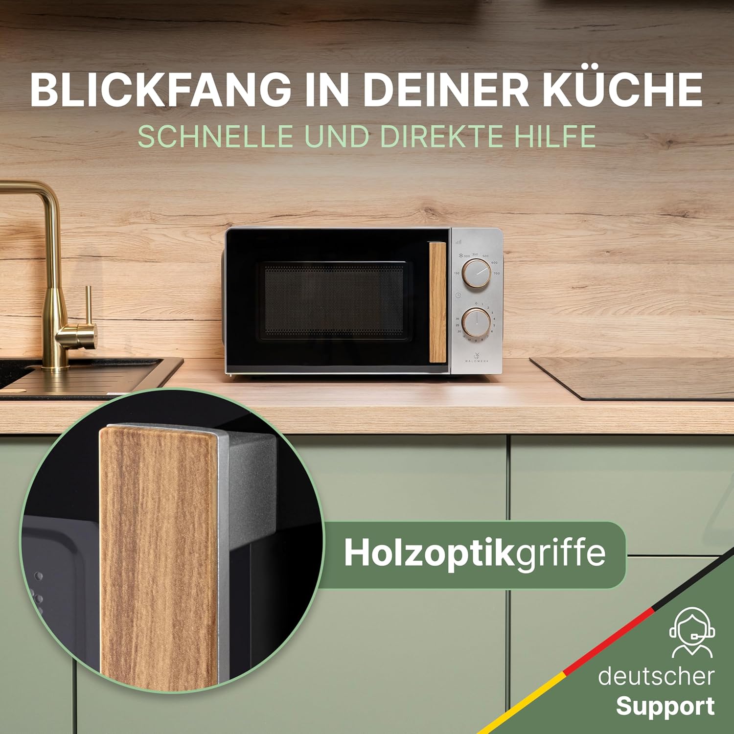 • Елегантни дръжки с дървен вид - придайте на вашата микровълнова фурна WALDWERK естествен, топъл вид. Стилните дръжки слагат край на студената пластмаса и осигуряват естетически акцент на вашия кухненски шкаф.