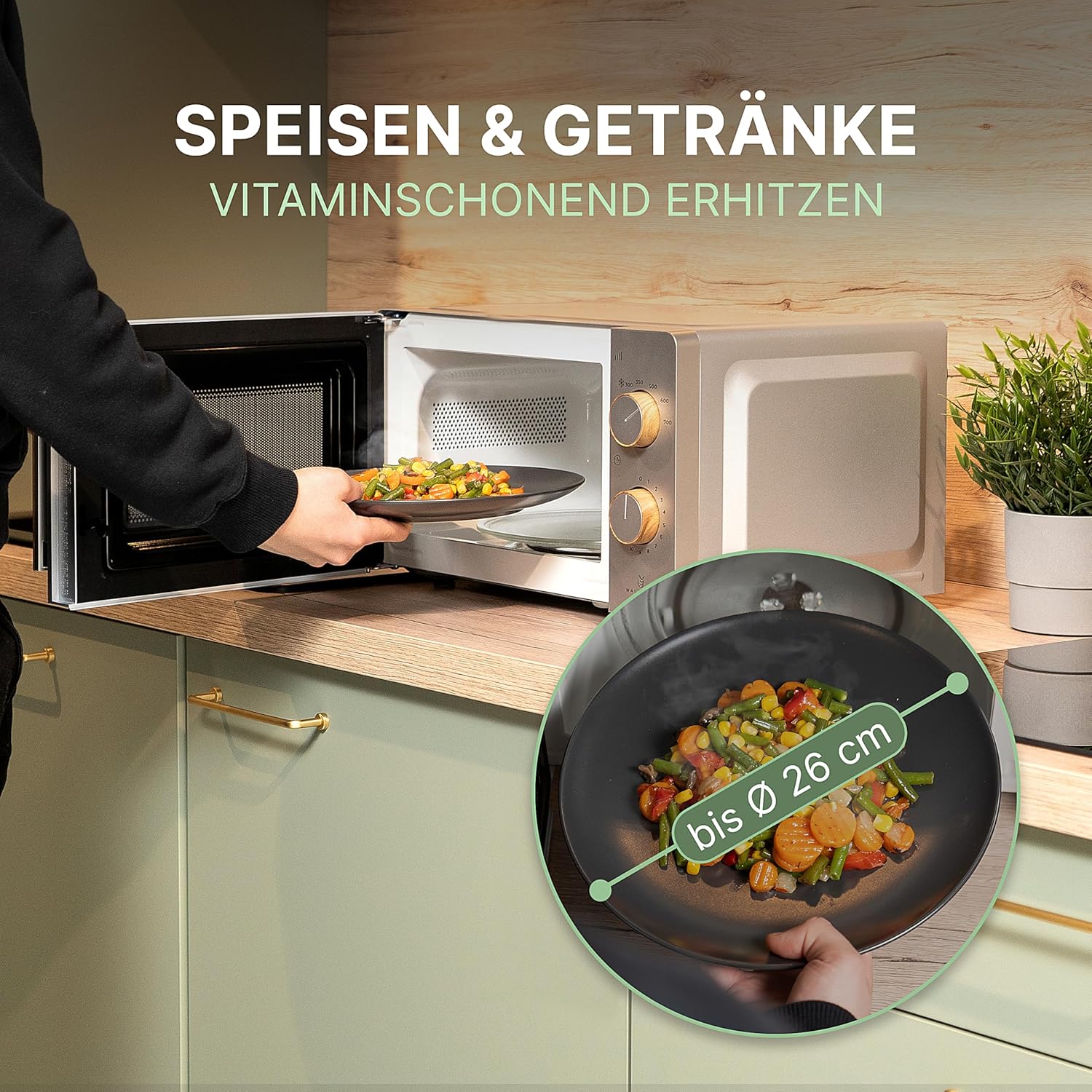 • Място за любимото ви място: Вашата нова микровълнова фурна е компактна, но огромна отвътре! С пространство за готвене 27 x 15 см, дори голямата ви чиния за хранене с диаметър до 26 см се побира лесно. Без изкривяване, без компромис.