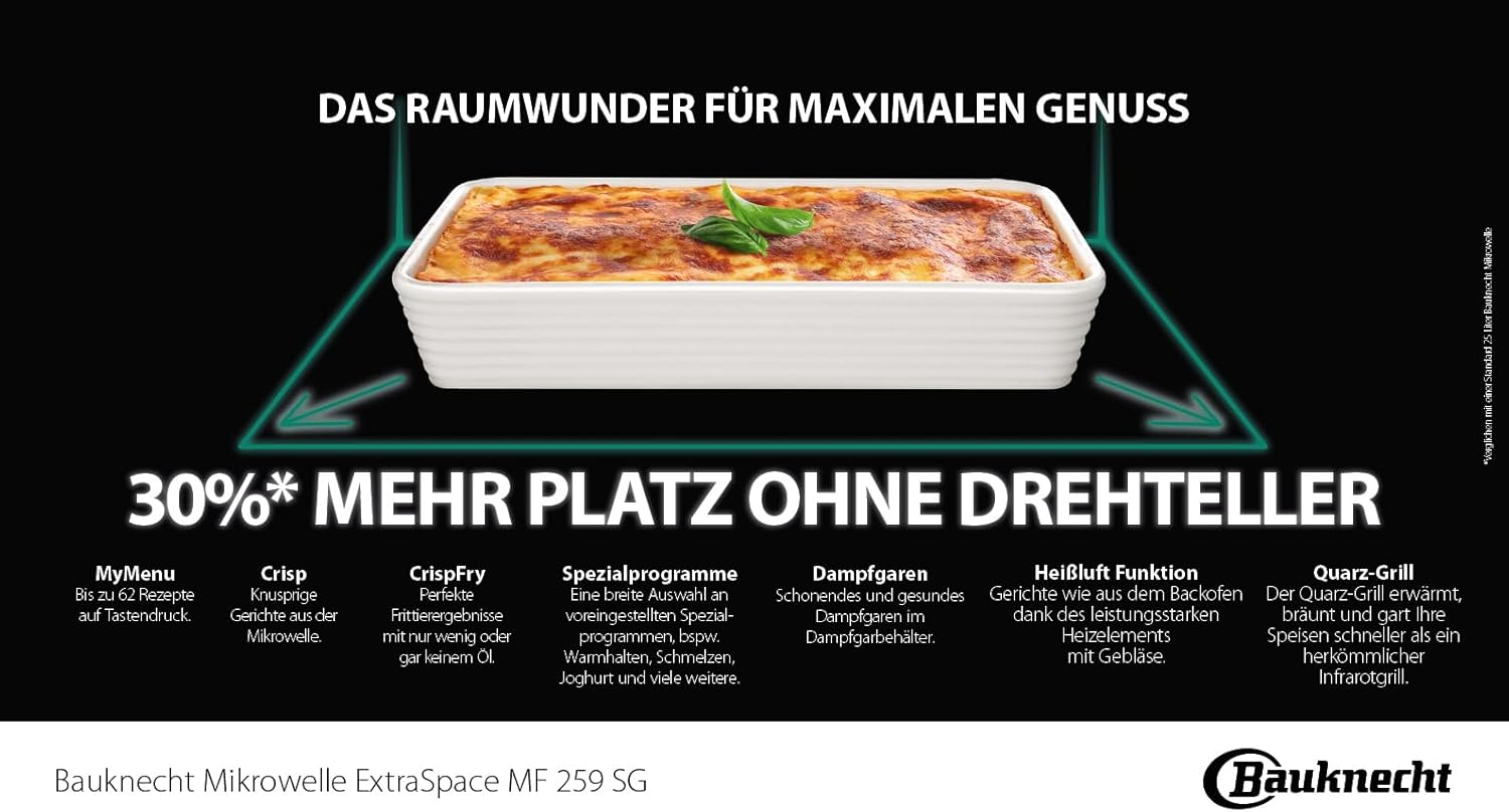 Микровълнова печка Bauknecht MF 259 SG/Допълнително пространство: Комбинация без въртяща се чиния/Моето меню/Хрупкаво пържене/Специални програми/Функция за готвене на пара, включително контейнер за готвене на пара/Горещ въздух/Кварцов грил/Автоматична