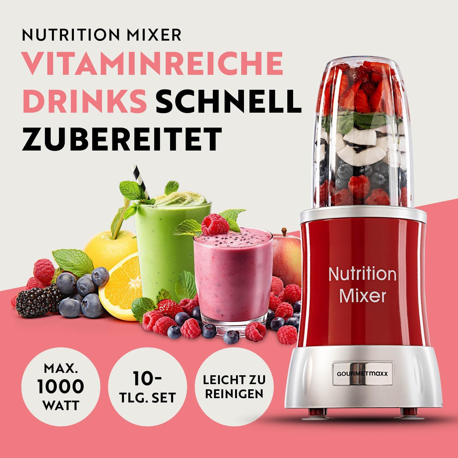 Миксер GOURMETmaxx Nutrition, машина за смутита с XXL комплект аксесоари, стационарен миксер, 11 части, блендер с рецепти, капаци за вкъщи и съхранение на храна, кухненски робот за смутита, шейкове и др.