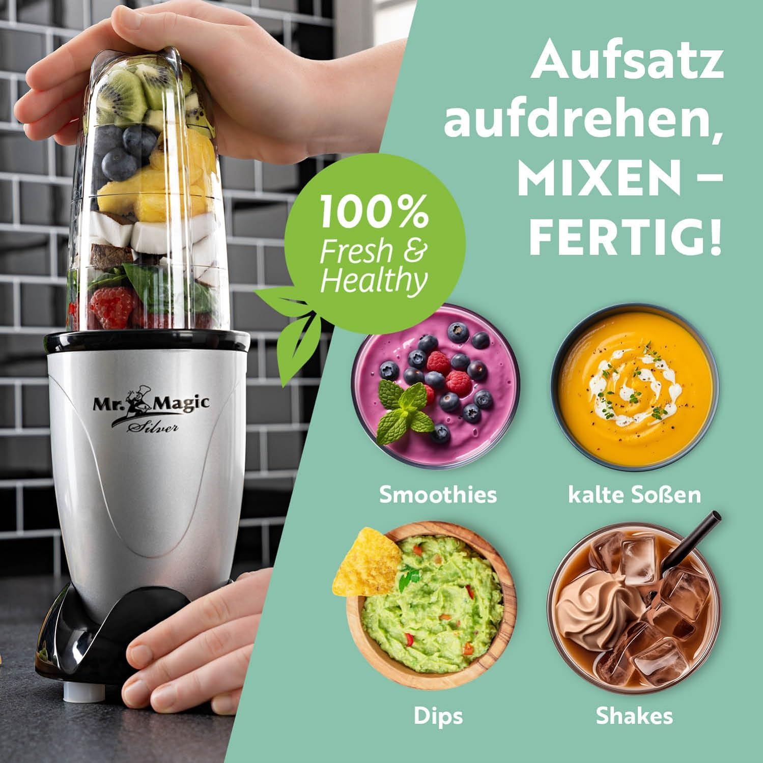 • Вашият ежедневен свеж заряд: креативни смутита, шейкове, коктейли, дипове и др. Наслаждавате се на всеки ден? Универсалният мултичопър е подходящ за почти всички кухненски идеи. Можете дори да приготвяте студени сосове и нарязани ядки с високопроизводителния миксер (не е подходящ за кубчета лед).