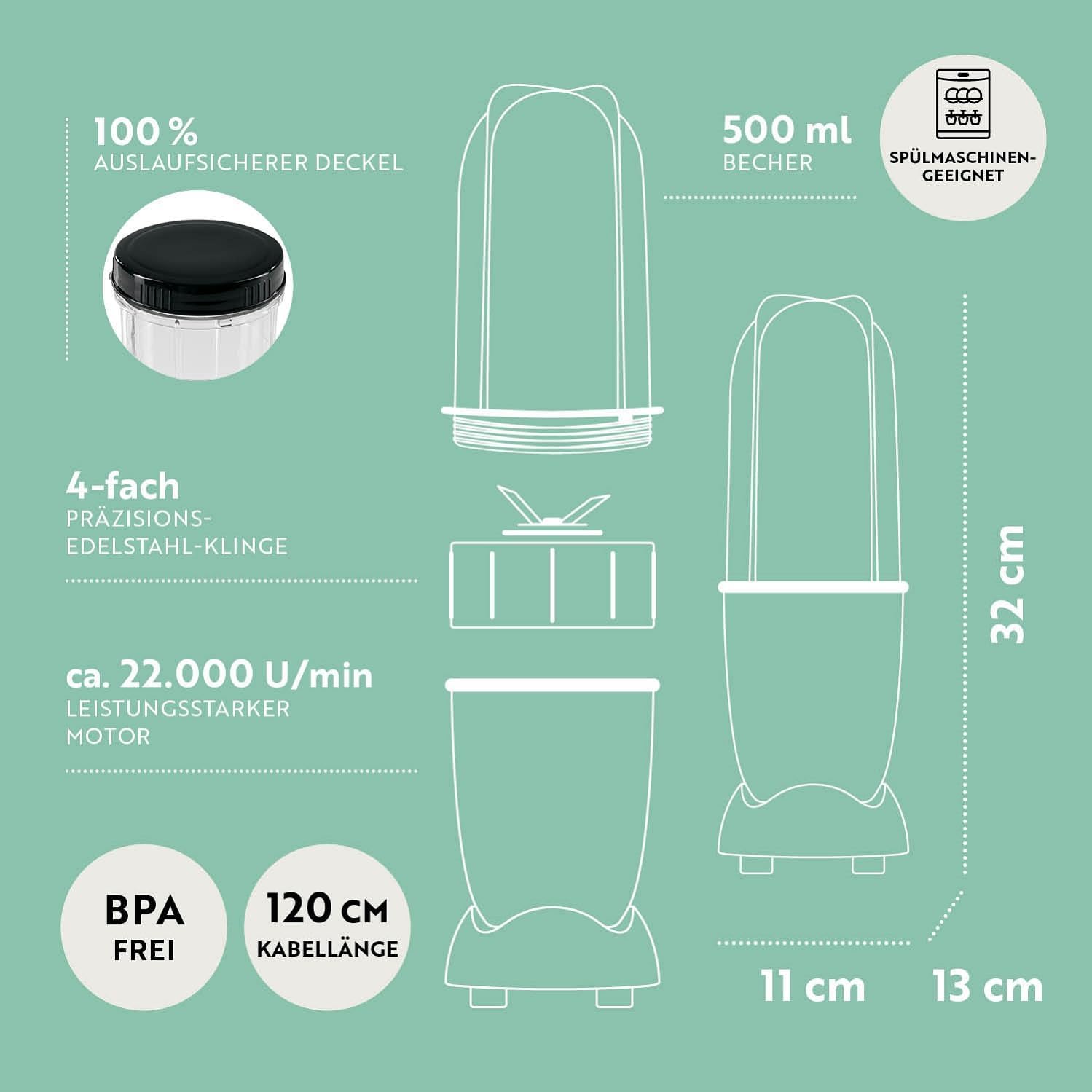 • Лесен за употреба: блендерът е за плодове, зеленчуци и др. Размери (В x Ш) приблизително 37x17,5 см. Това го прави подходящ дори за малка кухня. Управлението е супер практично: просто завъртете приставката, разбъркайте - готово! След това малкият миксер може лесно да се почисти и прибере.