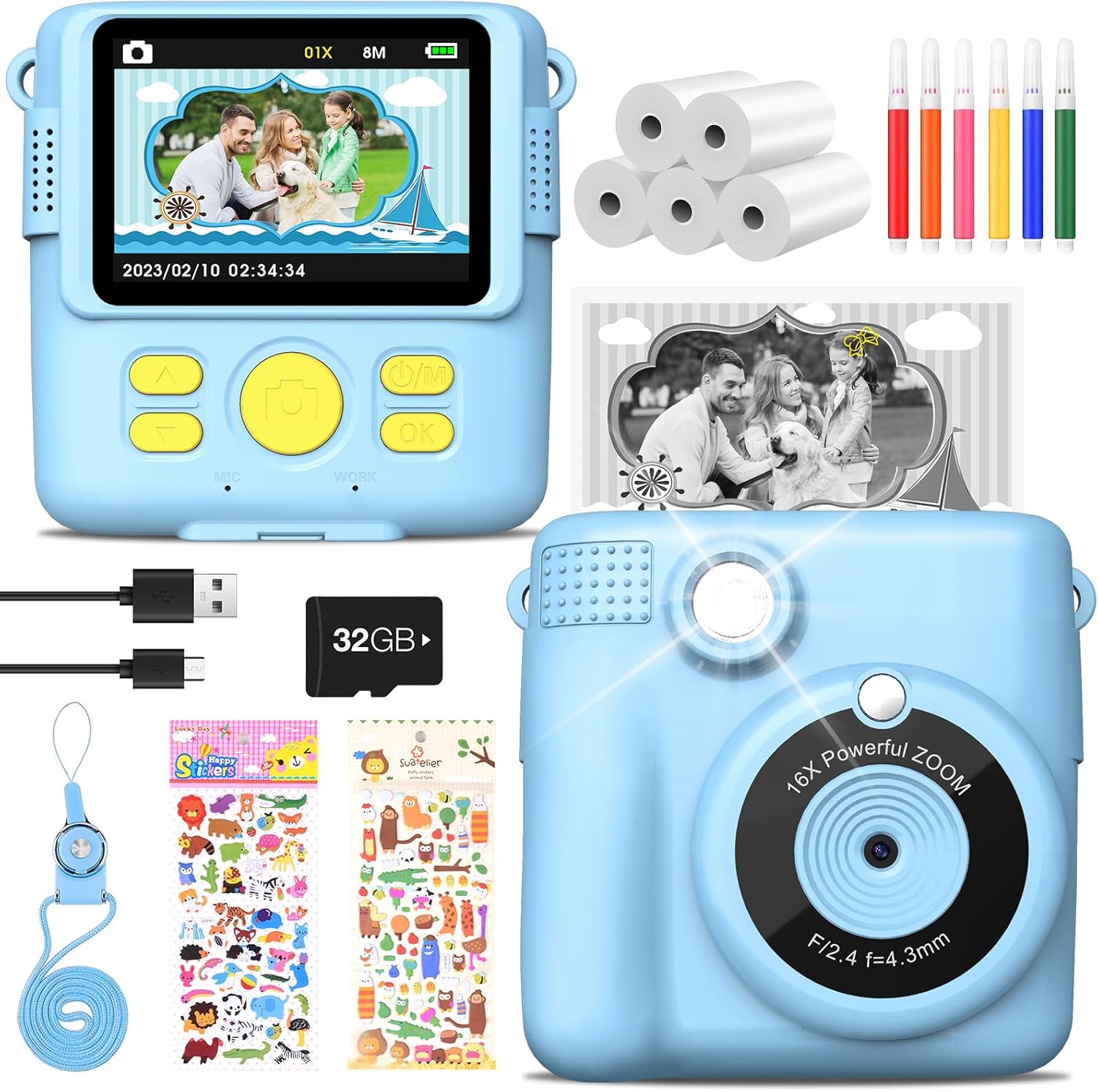 MILFECH Детска камера за моментално снимане 1080P 2.4-инчов екран Цифрова камера за деца с 5 ролки хартия за печат, 32GB карта, фотокамера с 6 цветни химикалки, 2 стикера Подарък за деца (син)