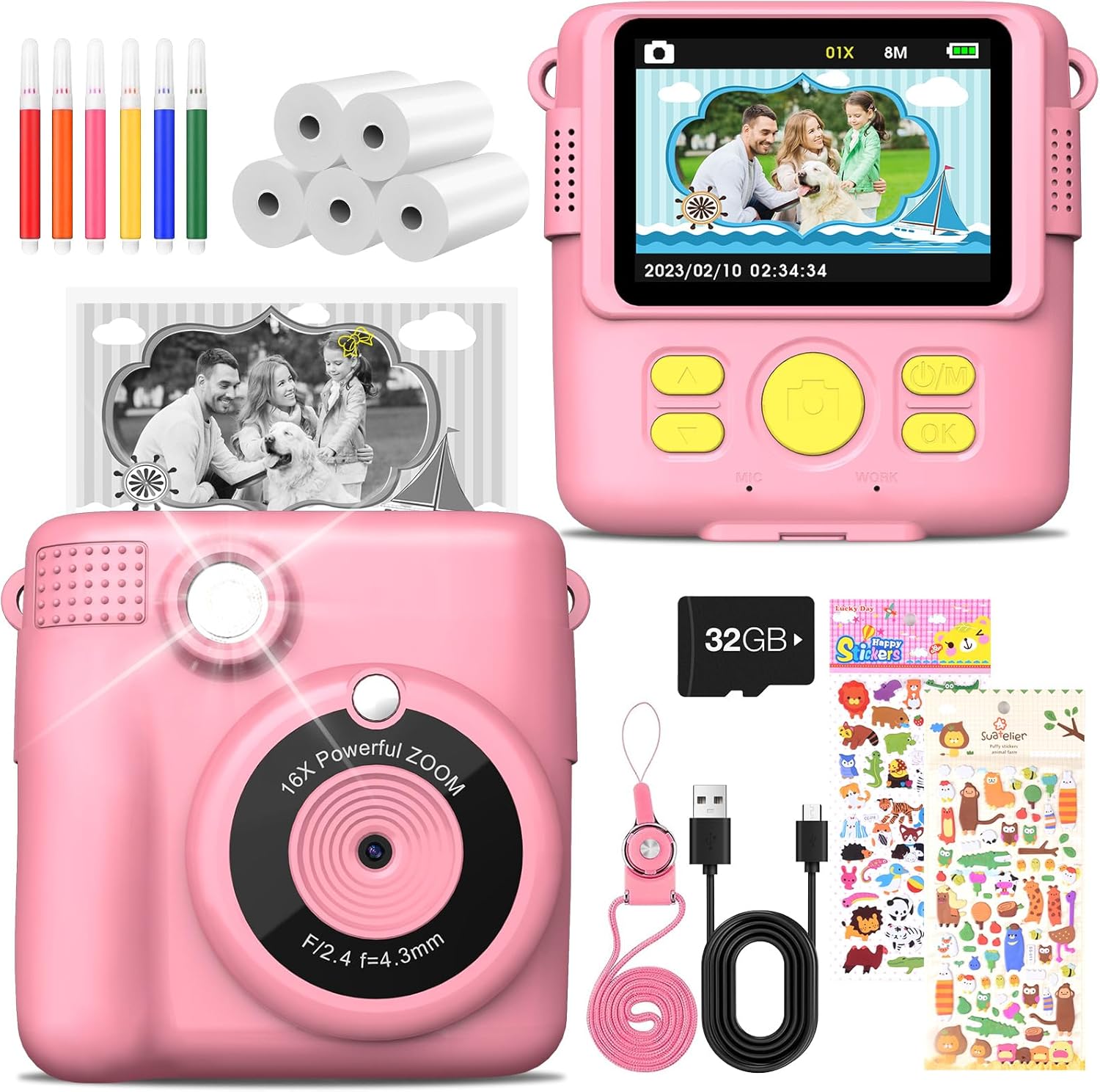 • Многофункционален детски дигитален фотоапарат - С незабавен печат, голям 2,4-инчов екран, 1080P видео, 16x цифрово увеличение, светкавица, timelapse, непрекъснато снимане, игри, филтърна рамка, MP3, аудио и видео запис и други; 4 пъзел игри, 18 вградени забавни фоторамки, 5 филтъра и 8 специални ефекта. Отговаря на различните нужди на децата.