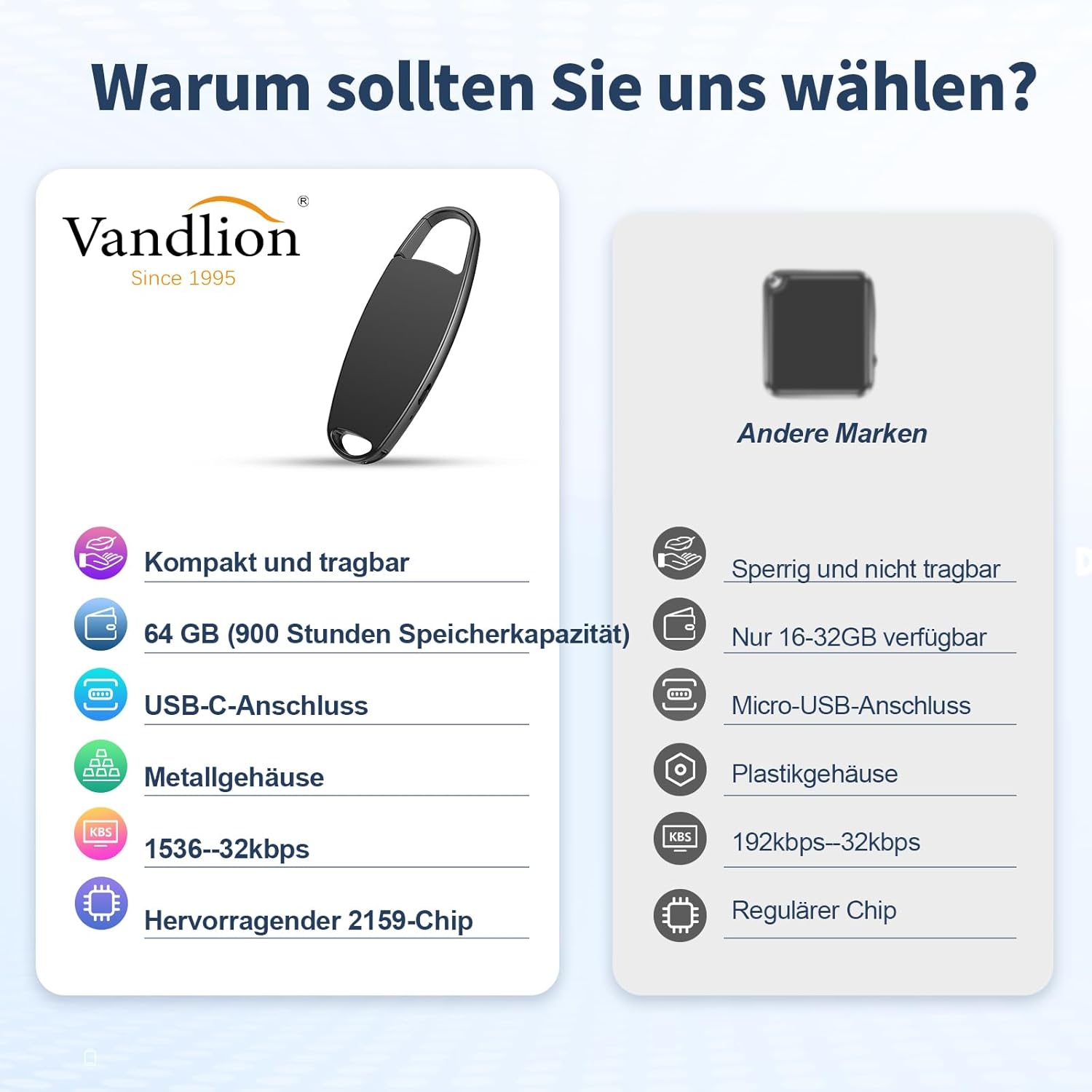 • Топло обслужване: Диктофонът Vandlion е идеален за студенти, учители, журналисти, бизнесмени и всеки, който иска да запечата специални моменти с гласа си. Чувствайте се свободни да се свържете с нашия екип за поддръжка, ако имате въпроси или проблеми. Предлагаме доживотна поддръжка на всички наши клиенти. Бърз отговор в рамките на 24 часа!