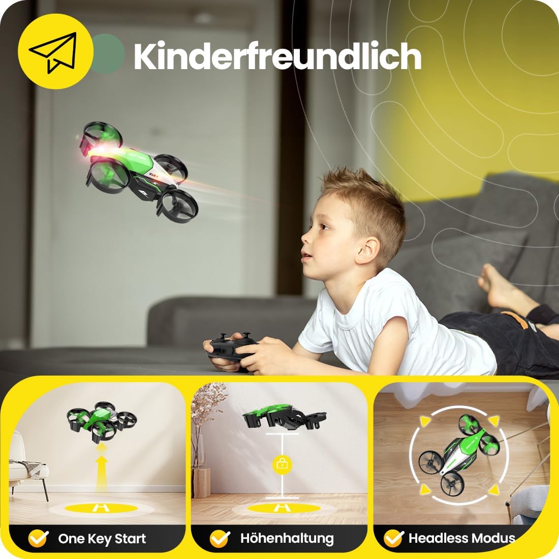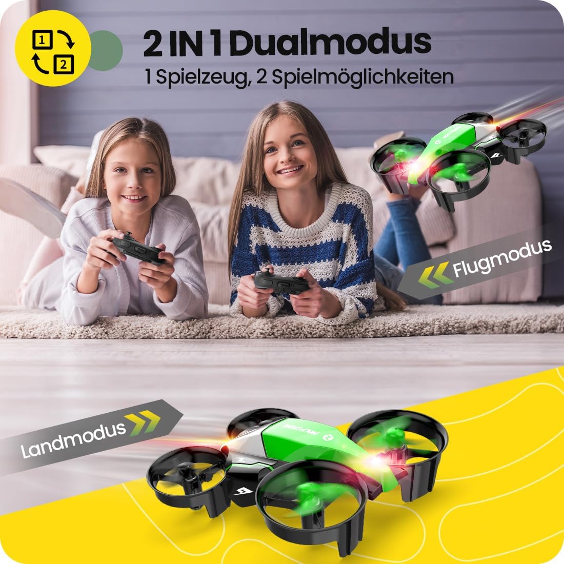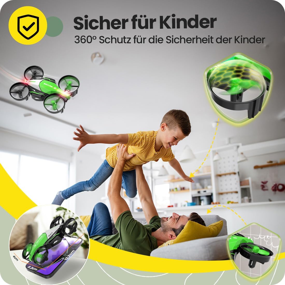 • Уникален 2-в-1 дизайн: разчупете границите между земята и небето. Това е мини дрон, който е и летяща кола. Тази уникална комбинация от дрон и RC кола ви предлага двойно забавление и несравнима свобода във въздуха и на земята.
