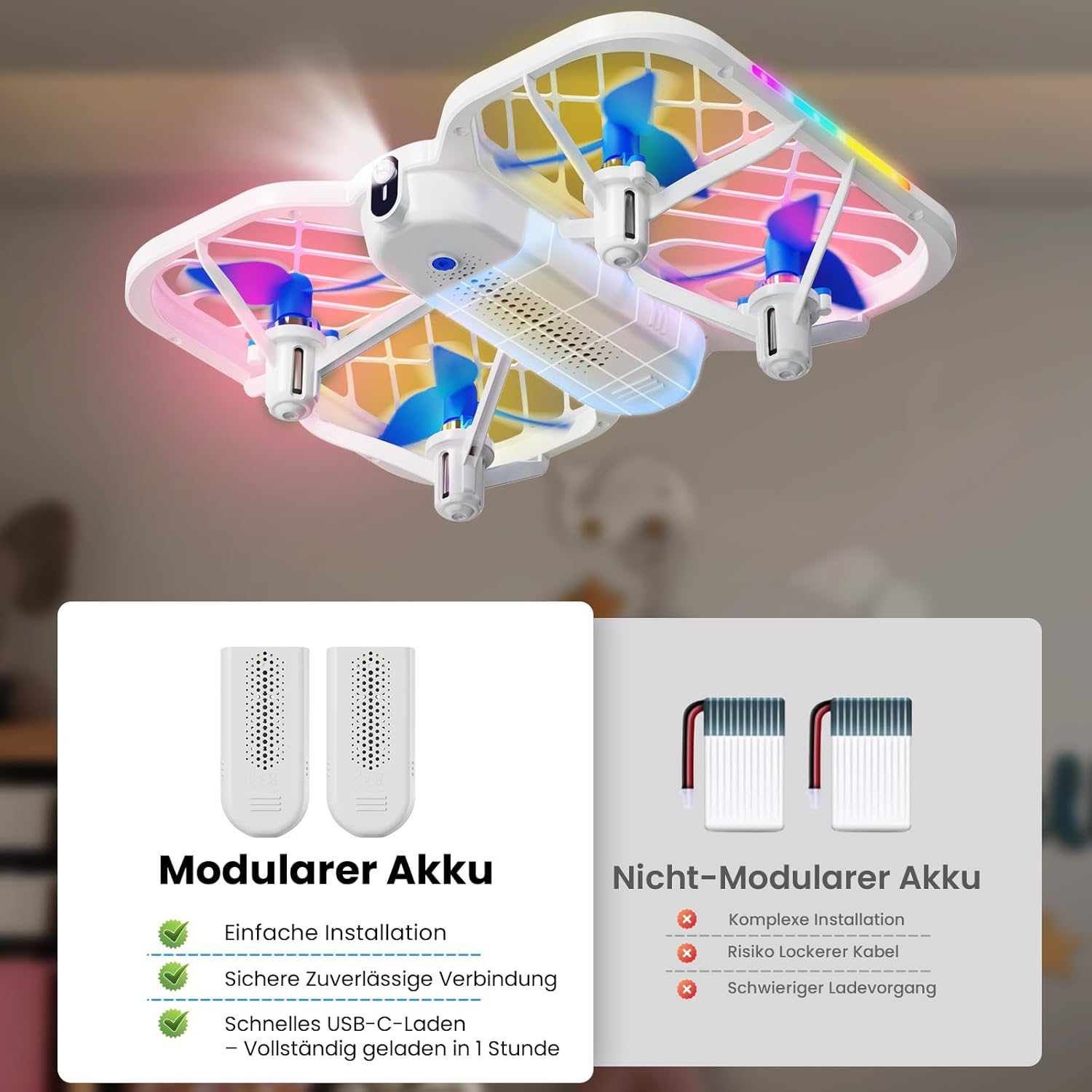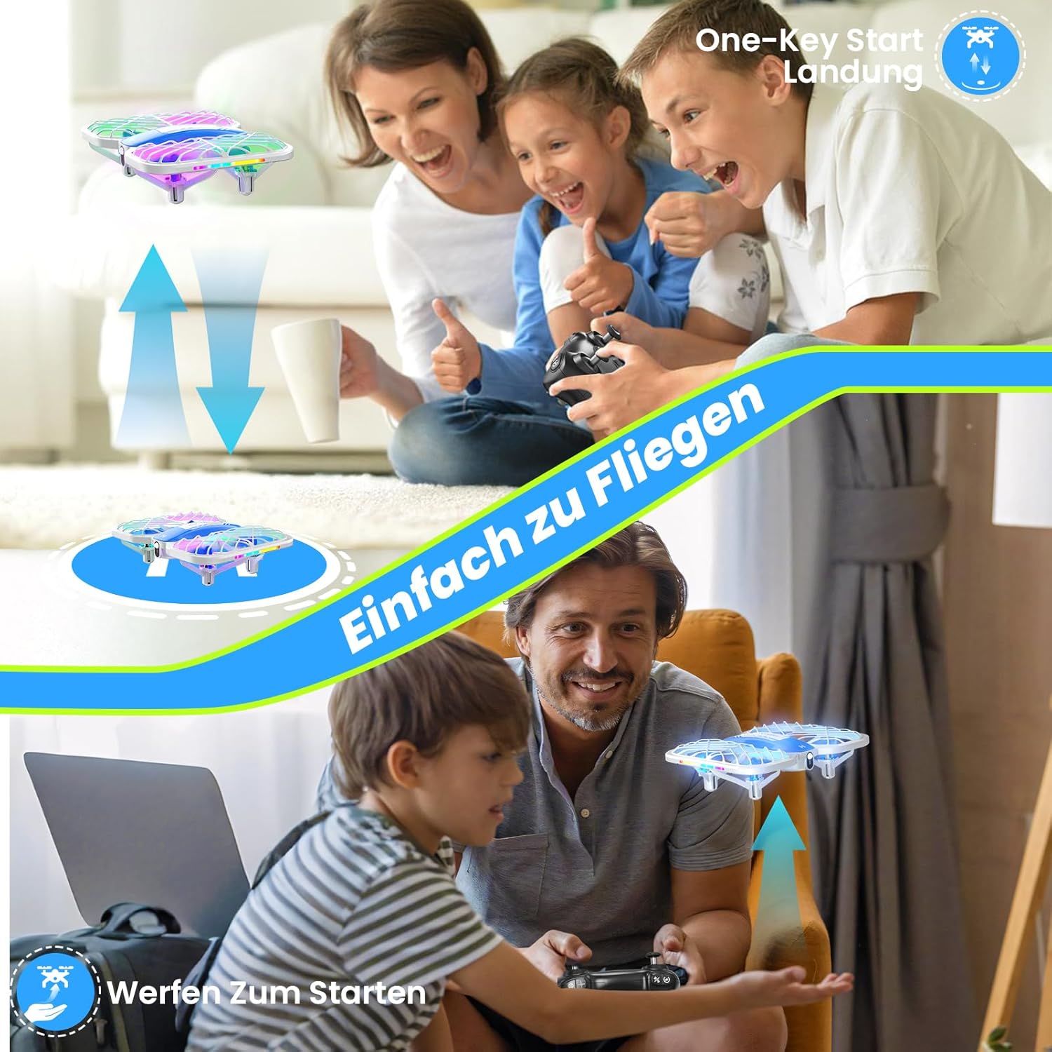 • Детско забавление: този мини дрон за деца е оборудван с 5 превключващи се LED режима на осветление, както и с функции за 360° завъртане и кръгов полет. Тези дронове без камера могат да създават цветни полетни ефекти, като същевременно стимулират детското въображение и креативност.