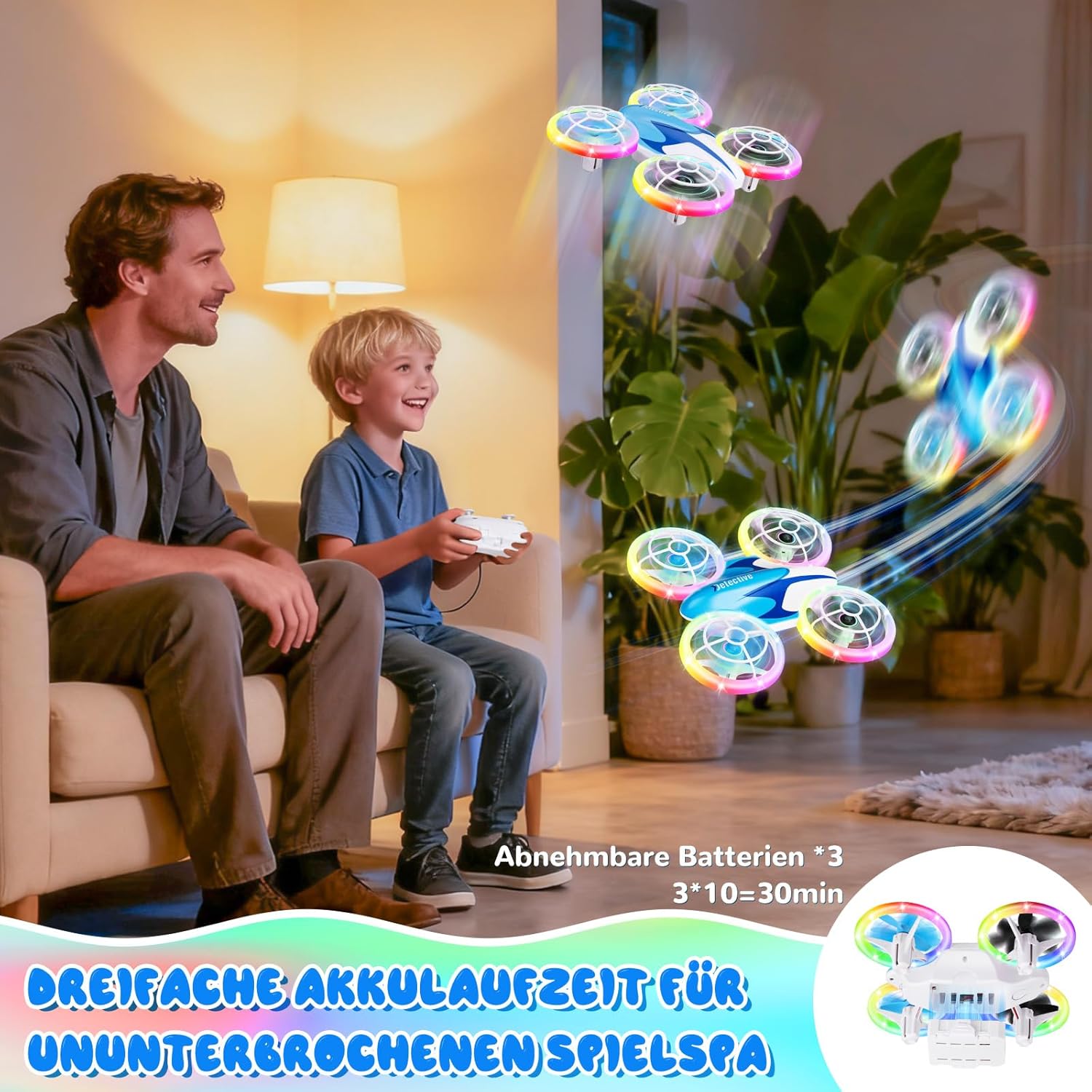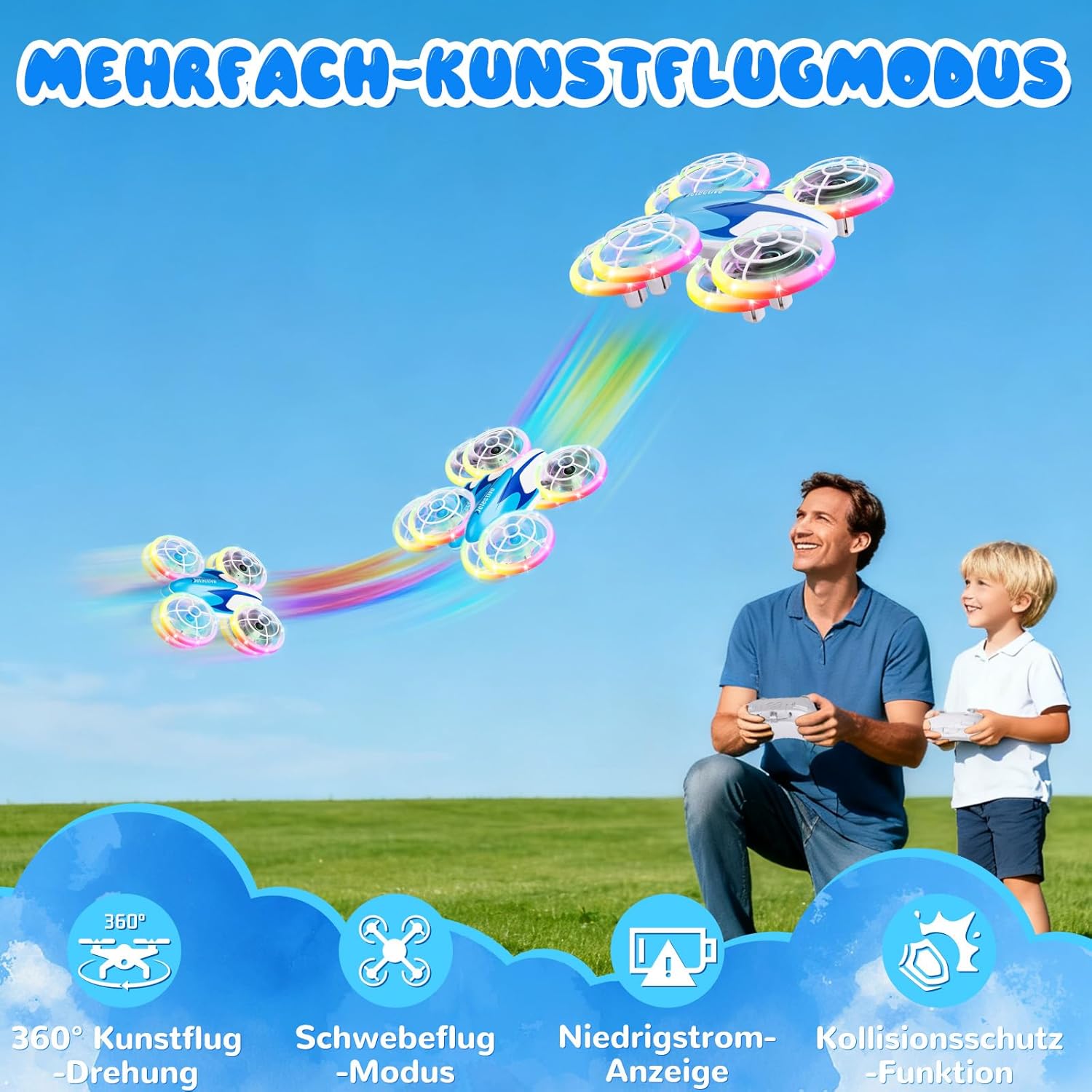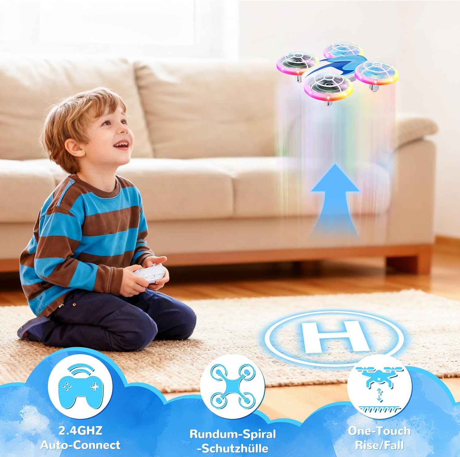 • ЗАБАВНИ КАСКАДИ С ЕДИН БУТОН: Забавното летене е лесно за управление! Оборудван с 360° завъртане, режим без глава и функция за автоматично плаване, този детски дрон може да се издига и да се носи на желаната височина с натискането на един бутон. Дронът може без усилие да изпълнява 360° каскади на височина от 3 метра и носи на децата страхотни летателни приключения!