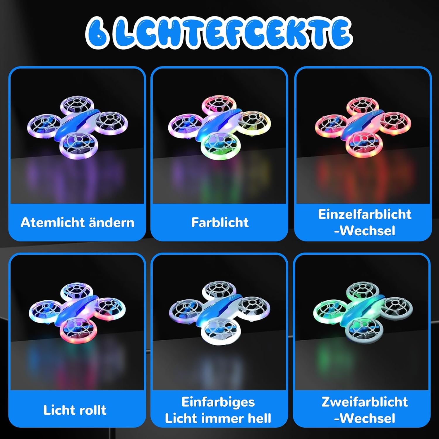 • 6-цветно преливащо светлинно шоу: този детски дрон е оборудван с шест ослепителни цветни динамични светлинни ефекта, които осигуряват уникално изживяване при полет, помагат на децата лесно да определят посоката през нощта и стимулират сензорното изследване. Дронът е оборудван със супер готино светлинно шоу, което повишава интереса на децата към летенето, което го прави перфектен спътник за нощно забавление.