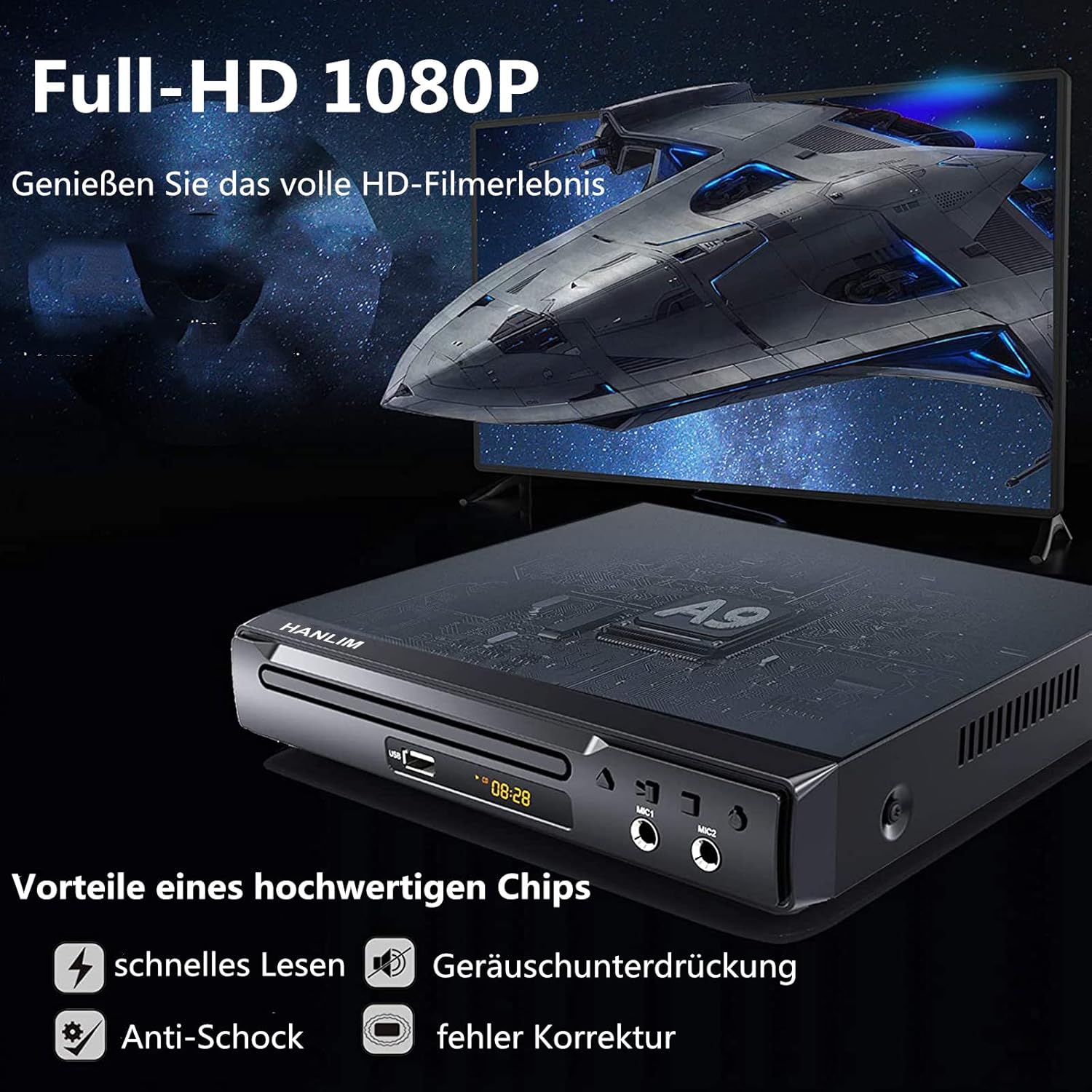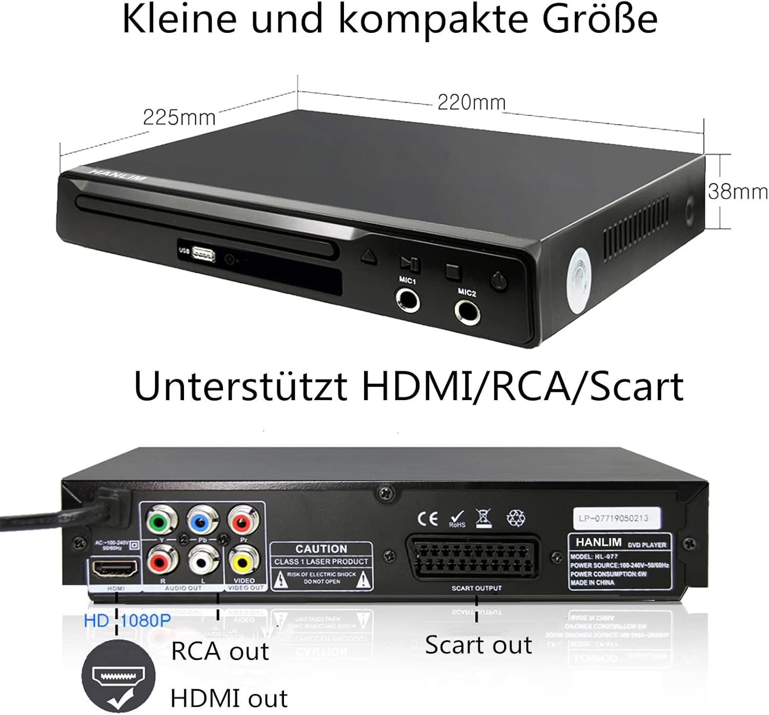 • Компактен размер: 22,5 x 22 x 3,8 см (без издатини), лек, компактен размер, лесен за поставяне навсякъде, ниска консумация на енергия, автоматично изключване, съдържание на кутията: DVD плейър / дистанционно управление (AAA батерии, не са включени) / RCA кабел (1 м) / HDMI кабел (1,5 м) / ръководство за потребителя (многоезично, включено на немски).