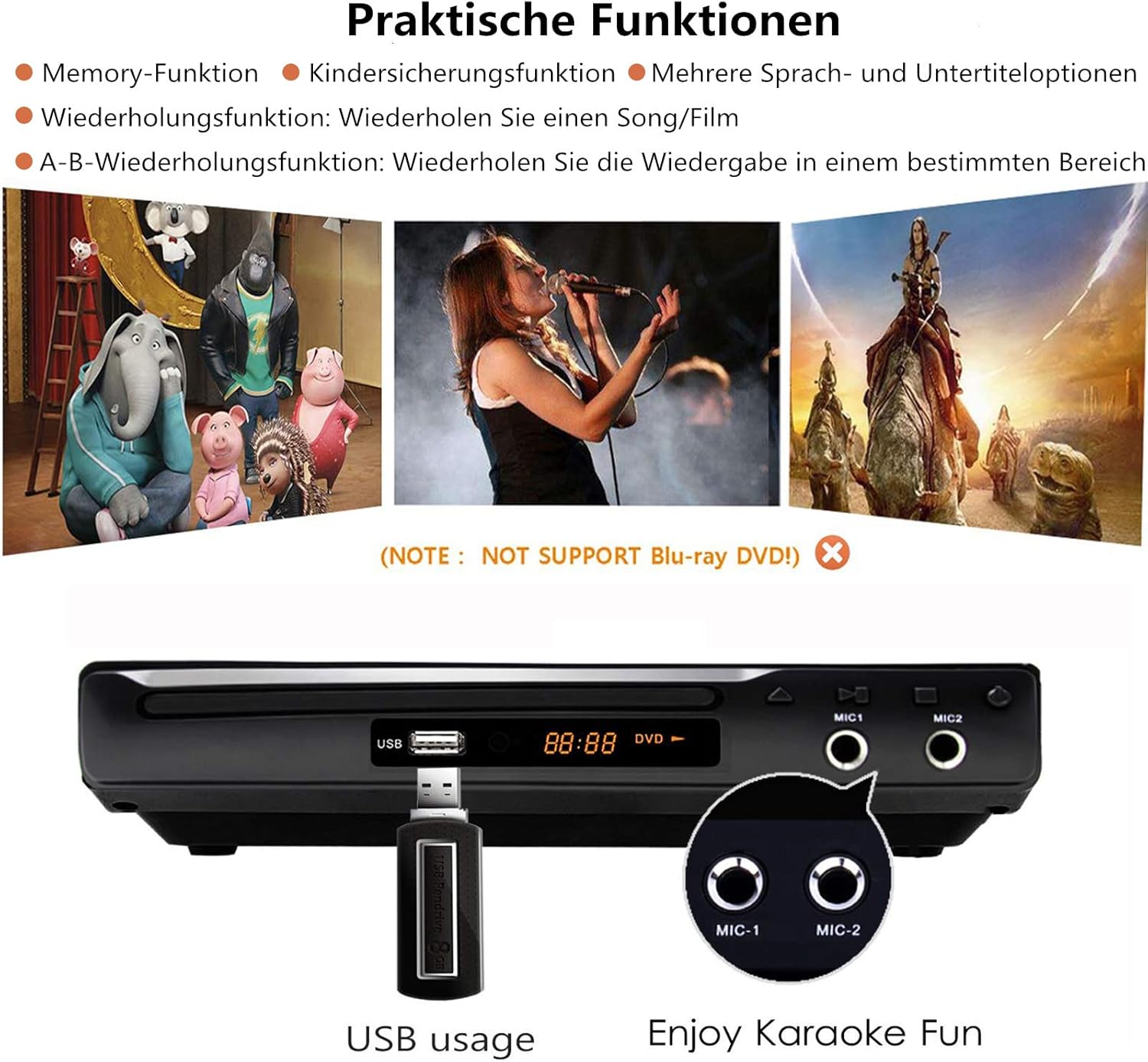 • [USB (до 32GB) и два порта за микрофон] Вграден USB порт за възпроизвеждане на цифрови медийни файлове, поддръжка за USB възпроизвеждане на медии: видео (AVI, DAT, VOB), mp4 / mkv/rmvb не се поддържат, аудио (MP3, WMA), изображения (JPG, JPEG). Вградени два порта за микрофон (6,5 мм жак), поддържа караоке