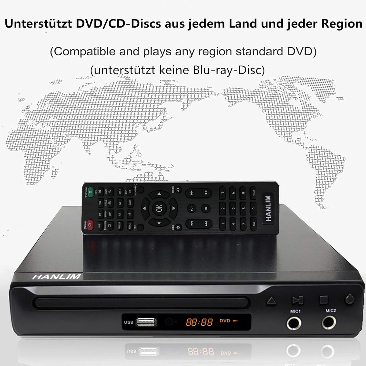 • [DVD плейър без регионални ограничения] DVD плейър без регионални ограничения, поддръжка на множество езици (немски, английски, френски, италиански, испански, иврит и др.), PAL/NTSC система (Германия: PAL, ако DVD плейърът има само звук и няма картина или картината е черно-бяла, моля, натиснете бутона "N/P" на дистанционното управление, след което проблемът ще бъде решен). Захранване AC100-240V, 50Hz/60Hz