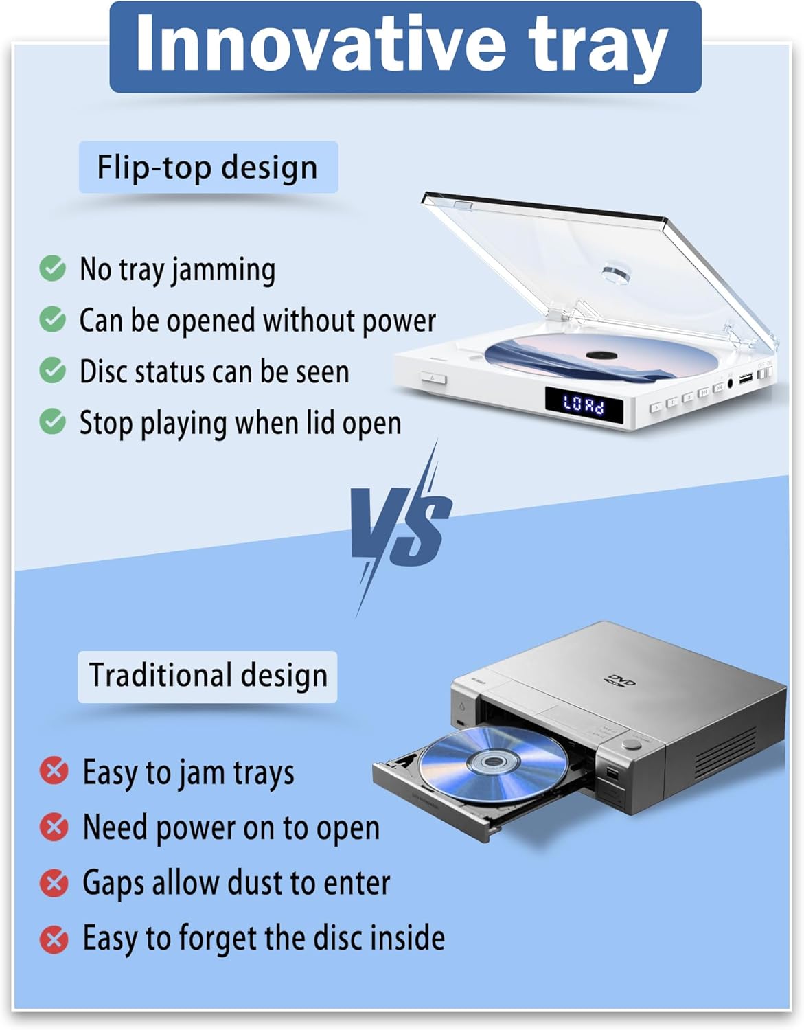 • ЛЕК, КОМПАКТЕН И УДОБЕН ДИЗАЙН Нашият домашен DVD плейър е проектиран различно от традиционните DVD плейъри. Той се побира лесно в малката ви раница и може да се носи навсякъде. Благодарение на дизайна с бутон, можете лесно да поставяте ценните си дискове, без да се притеснявате, че отделението ще заседне, а той предпазва любимите ви дискове, като предотвратява навлизането на прах и замърсяването им.