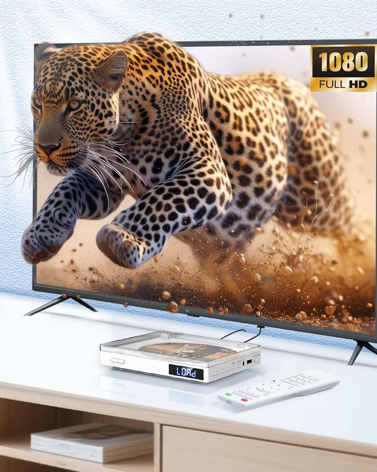 • Подобрено качество на картината и богати цветове: Този DVD плейър за телевизор може не само да свързва HD устройства като смарт телевизор, проектор и монитор чрез HDMI кабел, но и да свързва стари телевизори, високоговорители и усилватели чрез AV. DVD плейърът HDMI поддържа възпроизвеждане на пълна HD 1080p резолюция, реалистичното изображение и високопрецизното цветопредаване ще превърнат вашата спалня или хол в малко кино, насладете се на визуалния празник на реалистичното качество на изображението.