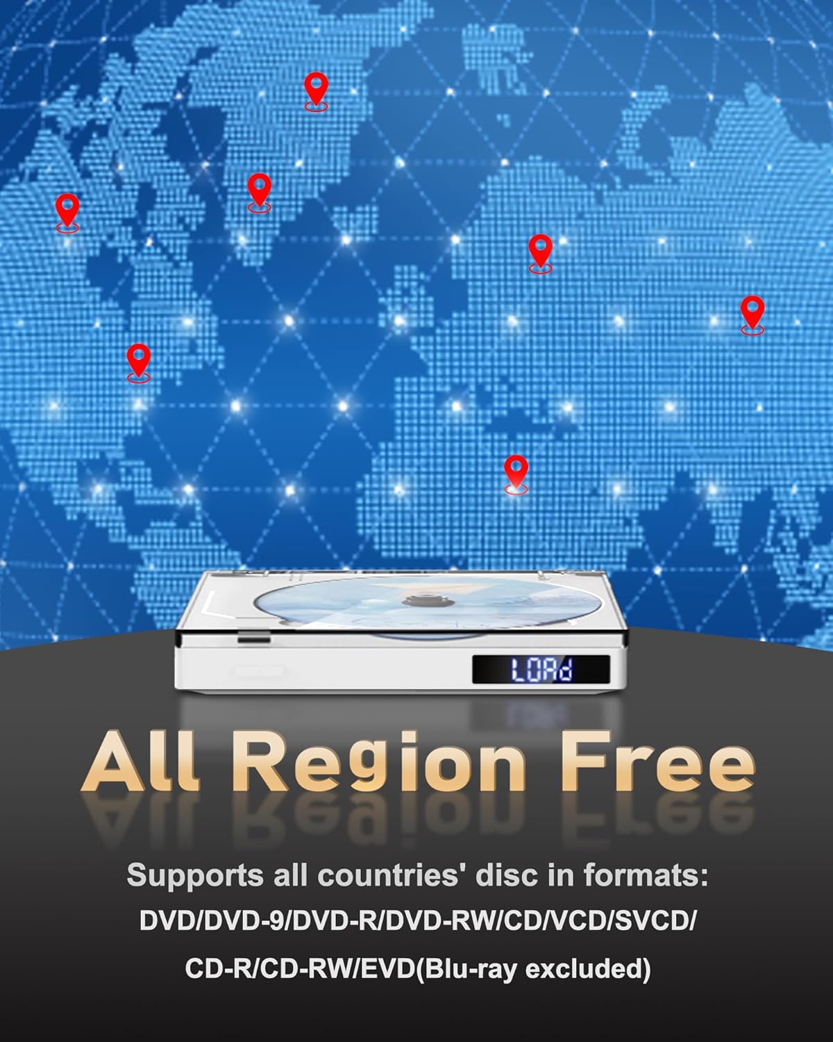 • Възпроизвеждане без регионални ограничения: DVD плейърът за всички региони поддържа възпроизвеждане на стандартни дискове от всички страни и поддържа DVD/SVCD/VCD/DVD-R/DVD-RW/CD/MP3/CD-R/CD-RW [Blu-ray, MP4 не се поддържа]. Освен това, този малък DVD плейър има функция за възпроизвеждане на паметта при изключване, която ви позволява да възобновите възпроизвеждането директно от последната позиция на изключване, за да продължите възпроизвеждането.