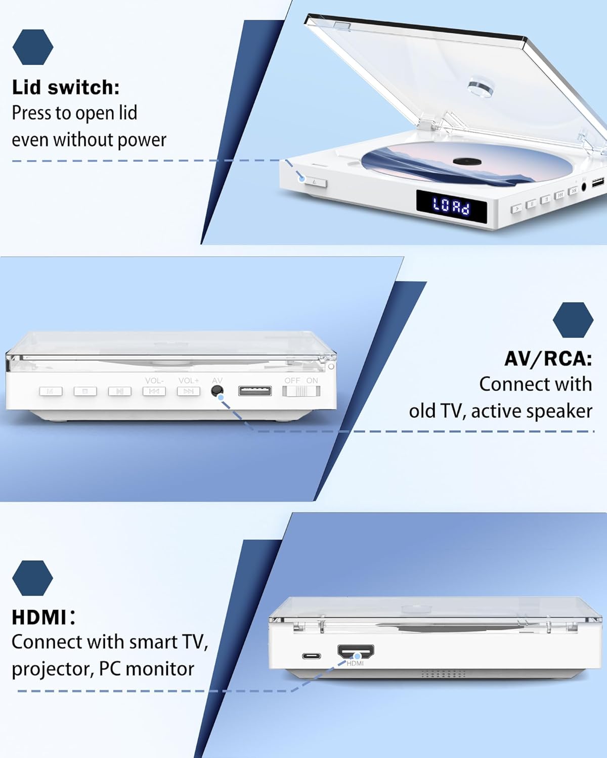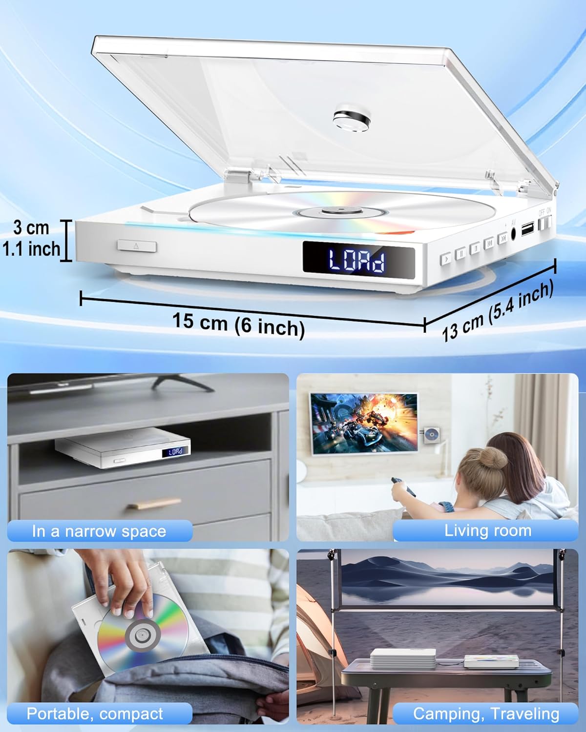 • DVD плейър „всичко в едно“: Този мини DVD плейър има множество функции и е многофункционален. Наслаждавайте се на страхотна музика от CD или пускайте DVD, когато искате да гледате филм, а също така можете да възпроизвеждате видео и аудио формати от USB памет. Компактен DVD плейър за всички ваши нужди от филмово забавление.