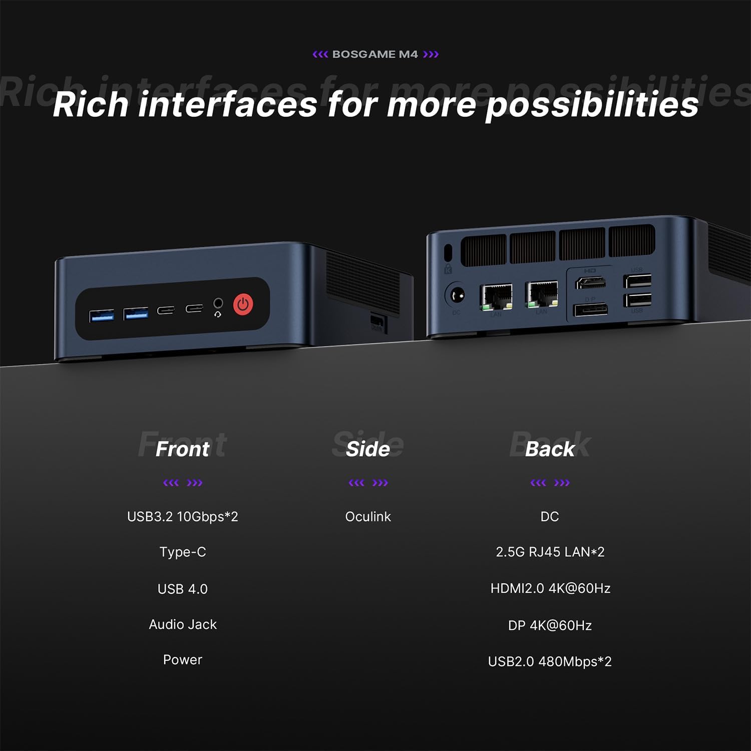 Мини геймърски компютър BOSGAME M4 OCulink с AMD Ryzen 7 8745HS, 8 ядра, 16 нишки, до 4.9GHz, 32GB DDR5, 1TB PCIe 4.0x4 SSD, USB 4.0, 2.5G LAN, Wi-Fi 6E, BT 5.2