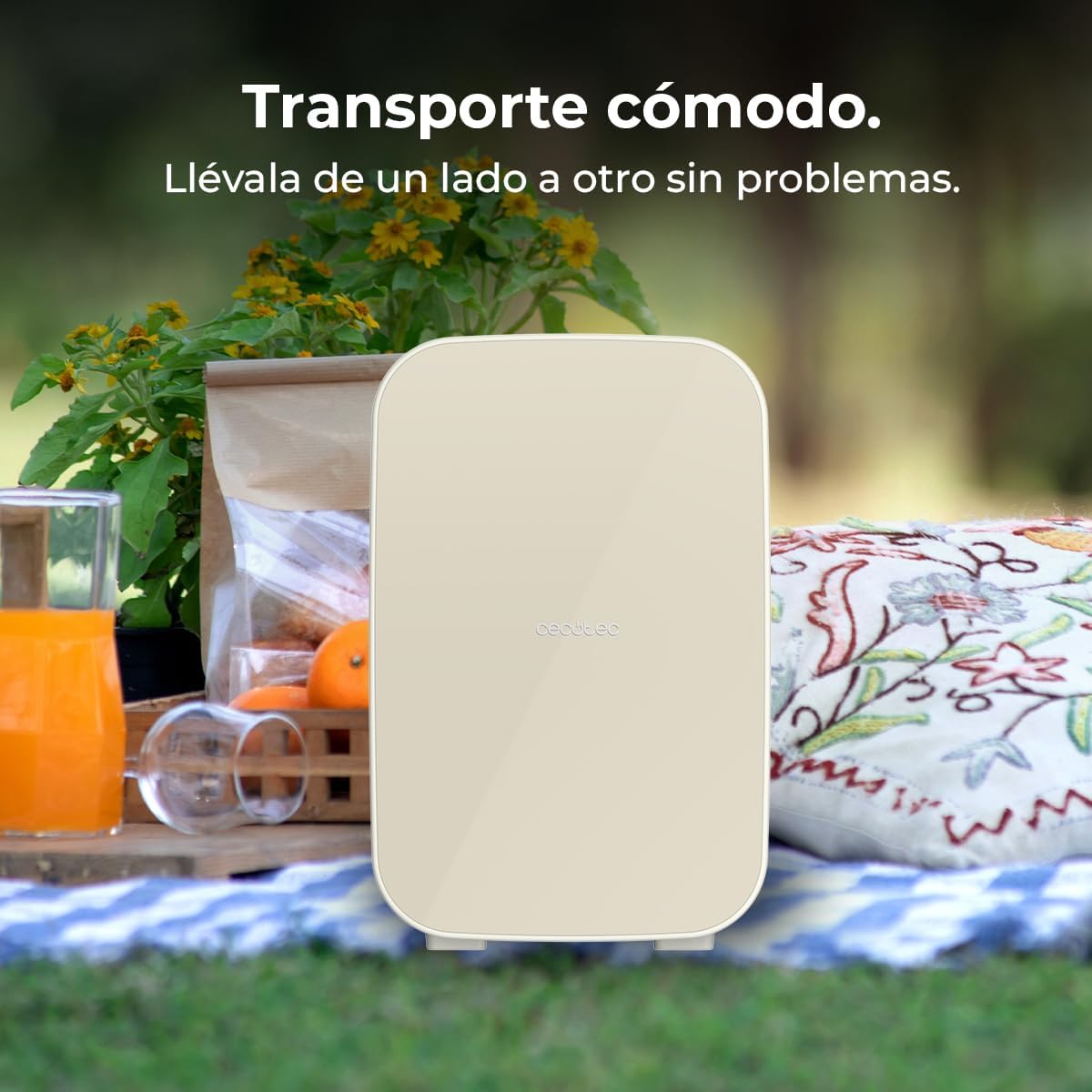Мини хладилник Cecotec Bolero MiniCooling 25L, цвят Bahamas Beige. Капацитет 20 литра, работа 12-220V, съвместим с автомобили и каравани, функция за охлаждане и отопление, регулируема температура от 7°C до 65°C.