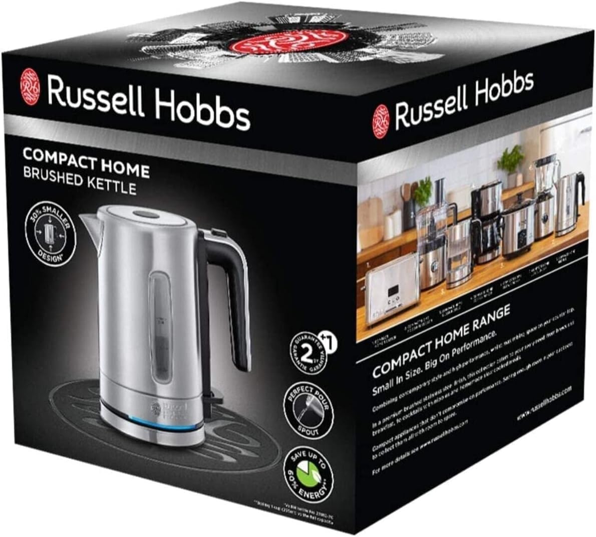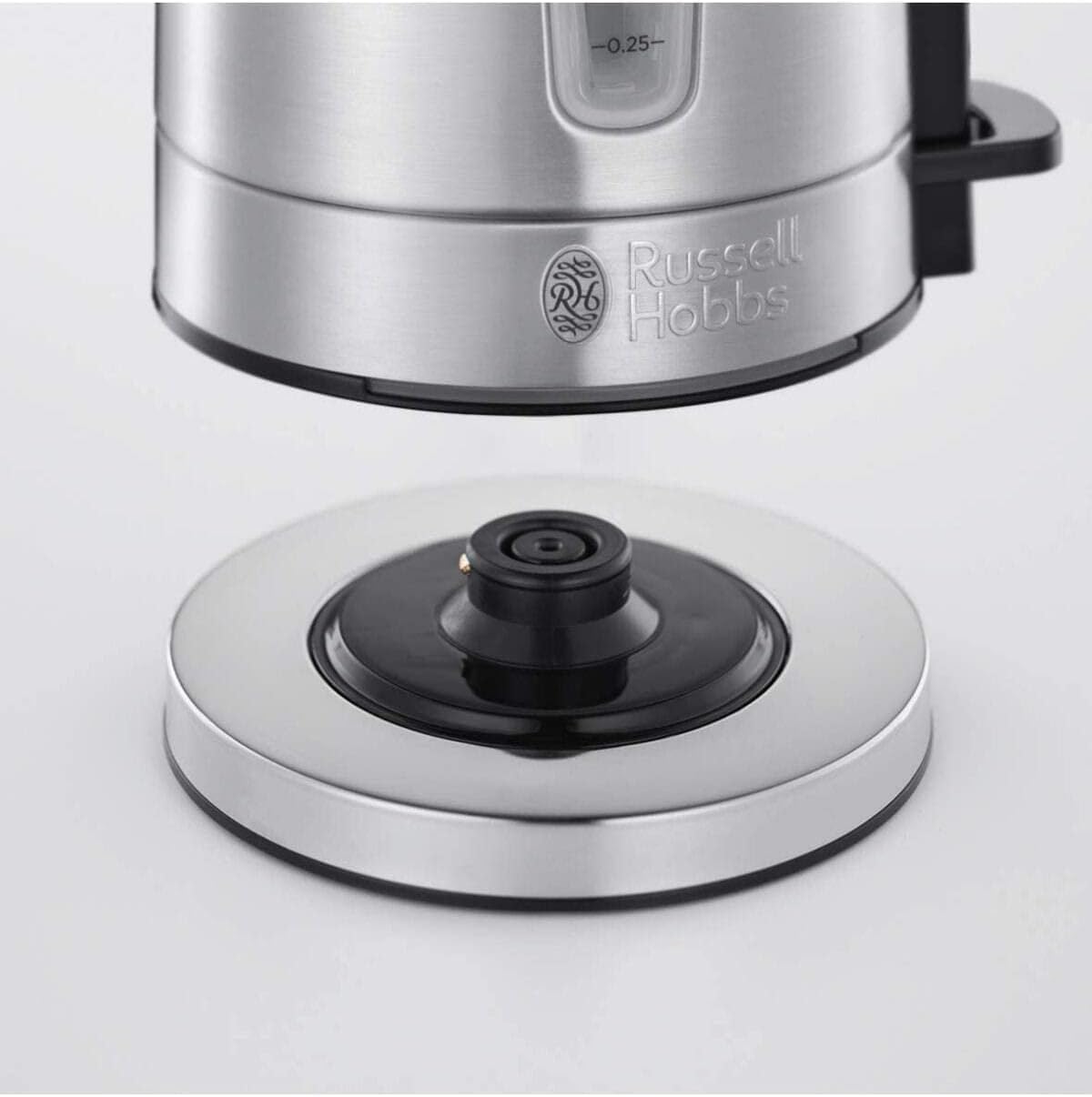 Мини кана Russell Hobbs Компактна неръждаема стомана, 0.8 л, 2200 W, LED осветление, филтър за котлен камък, оптимизиран чучур за наливане, спестяваща място, малка кана за пътуване, компактна машина за чай