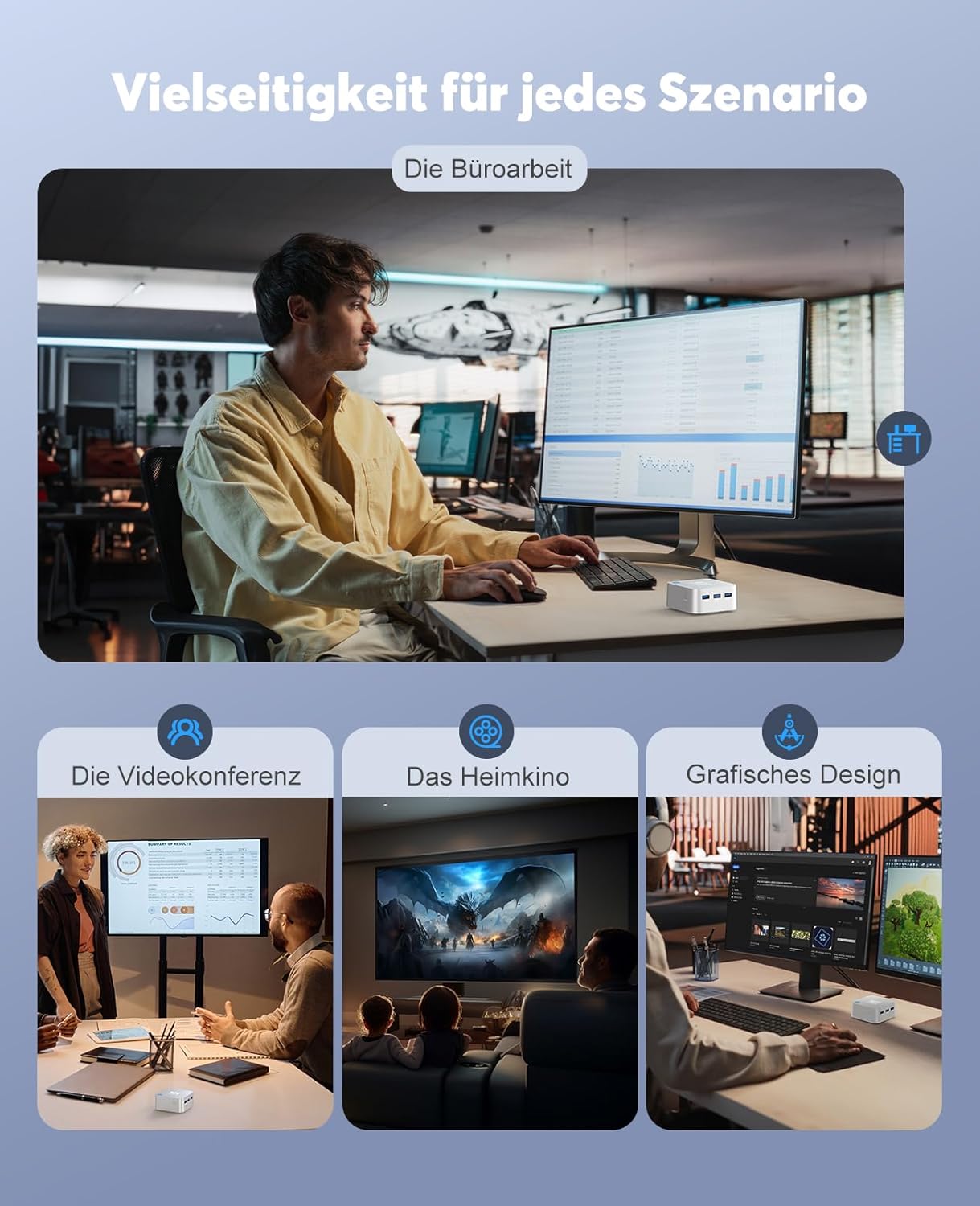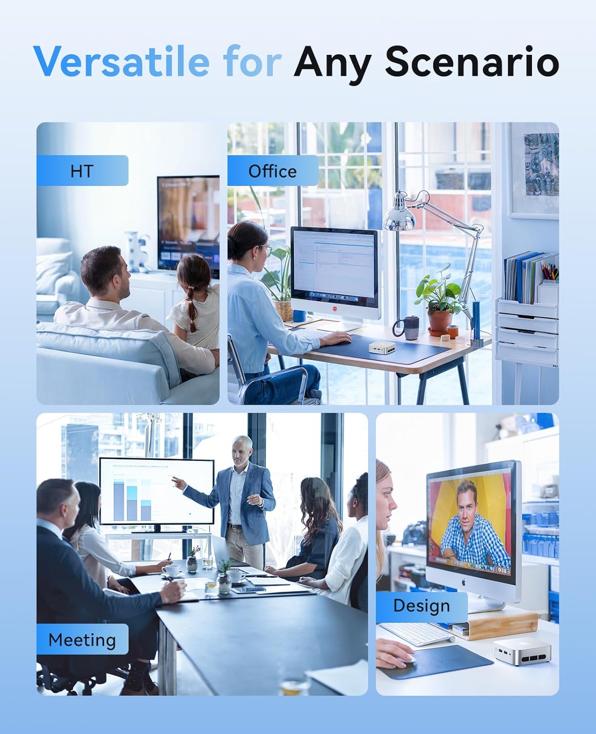 • 【Компактен и преносим – Джобен офис герой】С размери само 10 x 10 x 3,3 см и тегло 270 грама, V1 се побира във всяко куфарче! По желание можете да го прикрепите към монитора си с помощта на VESA стойка, за да спестите място на бюрото. Елегантният му дизайн го прави идеален спътник за домашни офиси и бизнеси – по-тих и по-спестяващ място от всеки настолен компютър.