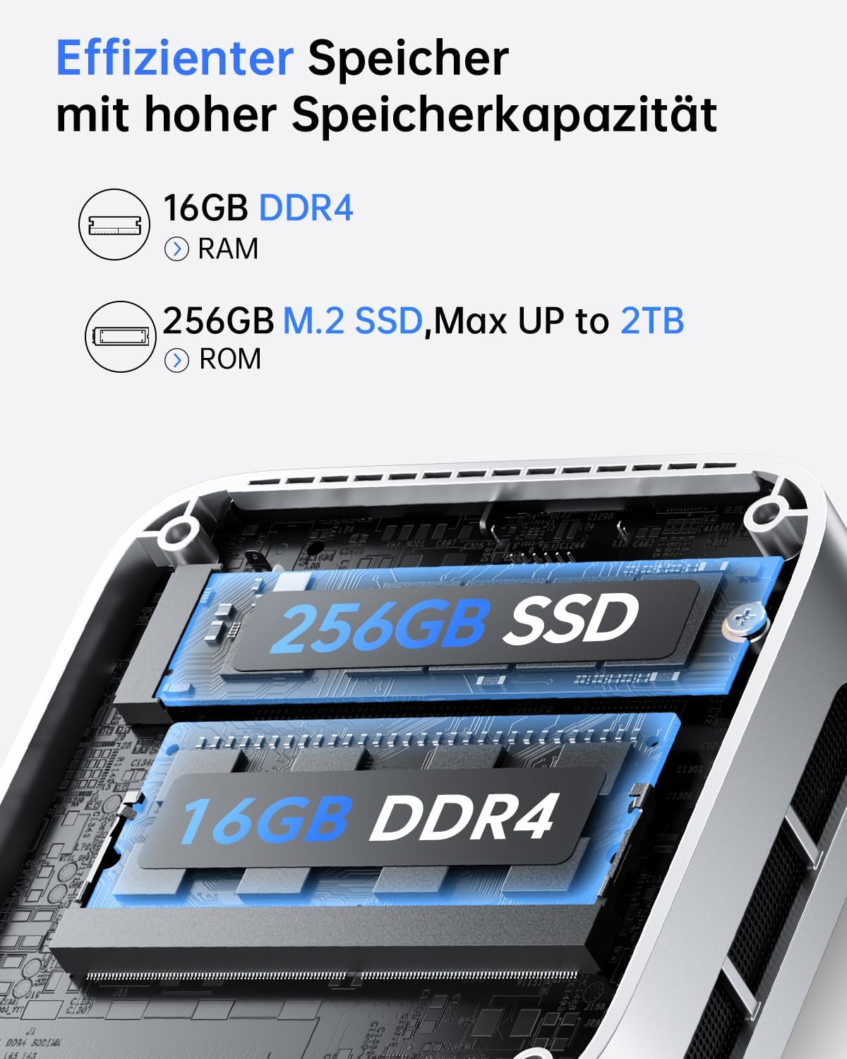 • 【Спецификации за съхранение】Мини настолният компютър V1 N97 разполага с 16GB едноканална DDR4 памет (максимум 16GB) и 256GB M.2 SATA SSD. Този SSD може да бъде разширен до 2TB. Компютърът може лесно да се справя с множество задачи едновременно, дори с взискателни приложения и големи файлове. Това ви позволява лесно да съхранявате вашите файлове и видеоклипове. Забележка: Поради компактния дизайн на устройството, разширяването чрез твърд диск не се поддържа.