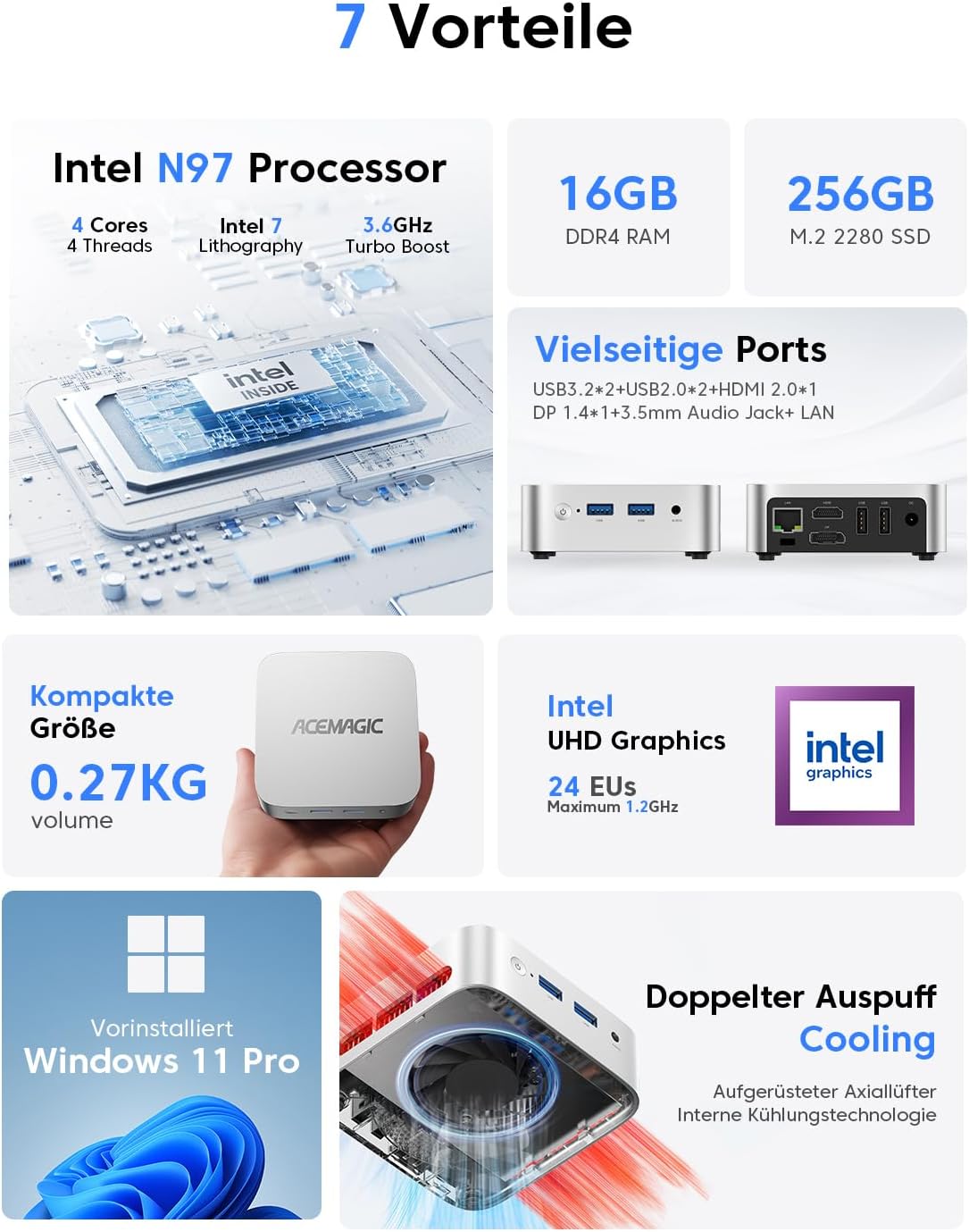 Мини компютър ACEMAGICIAN Vista Mini V1, Intel Alder Lake N97 Windows 11 Pro (до 3.60 GHz), 16GB DDR4 256GB M.2 SSD, мини компютър с RJ45 | 4K HDMI+DP | WiFi 5 за дома/офиса/училище