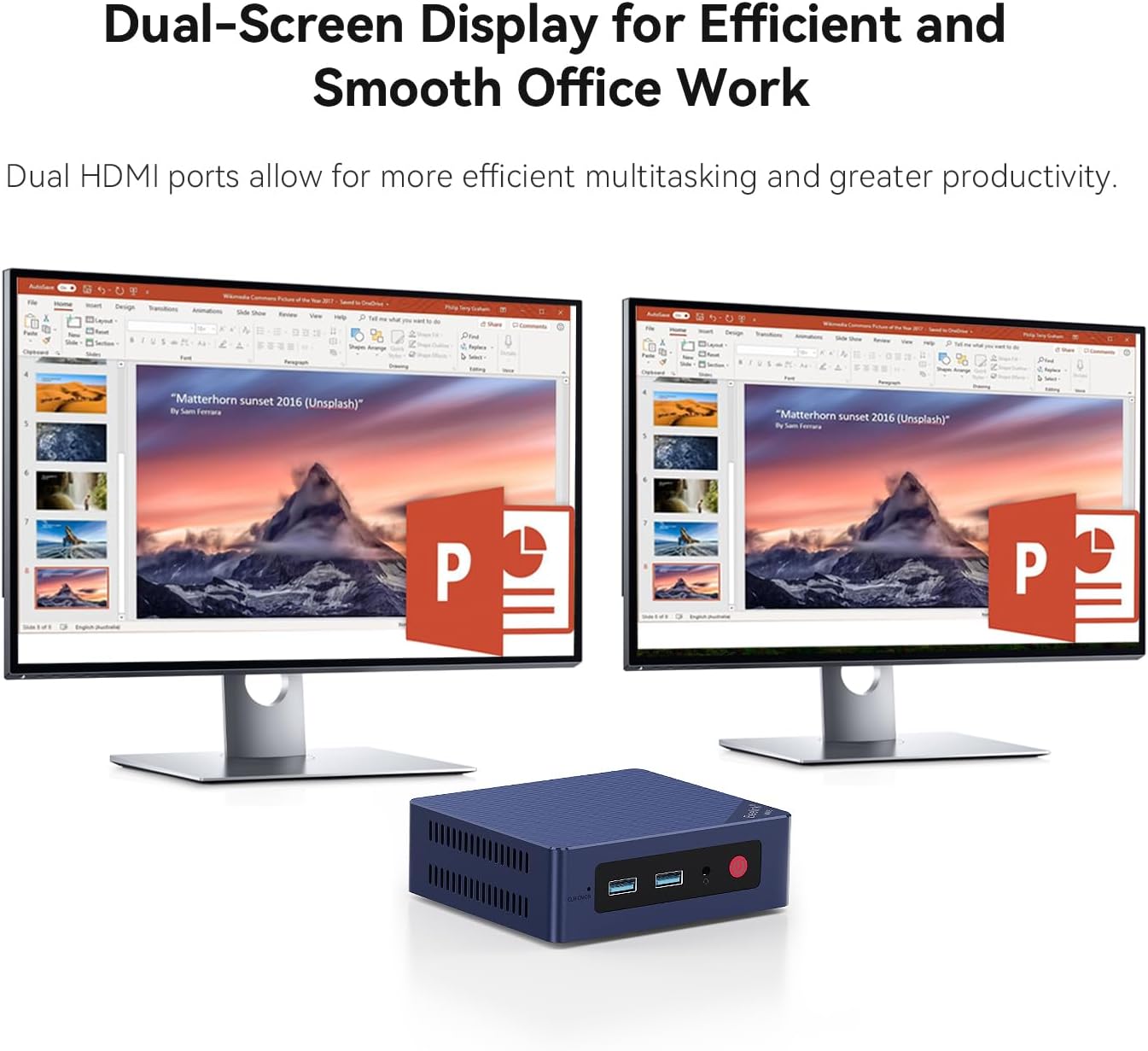 • ????【4K дисплей с два екрана】Мини компютърът MINI S13 е оборудван с Intel UHD графика, която поддържа 4K@60Hz, осигурявайки по-ясно и плавно видео изживяване. HDMI x 2 ви позволява да свържете два монитора едновременно, което ви позволява да работите по-ефективно и да увеличите максимално производителността си!