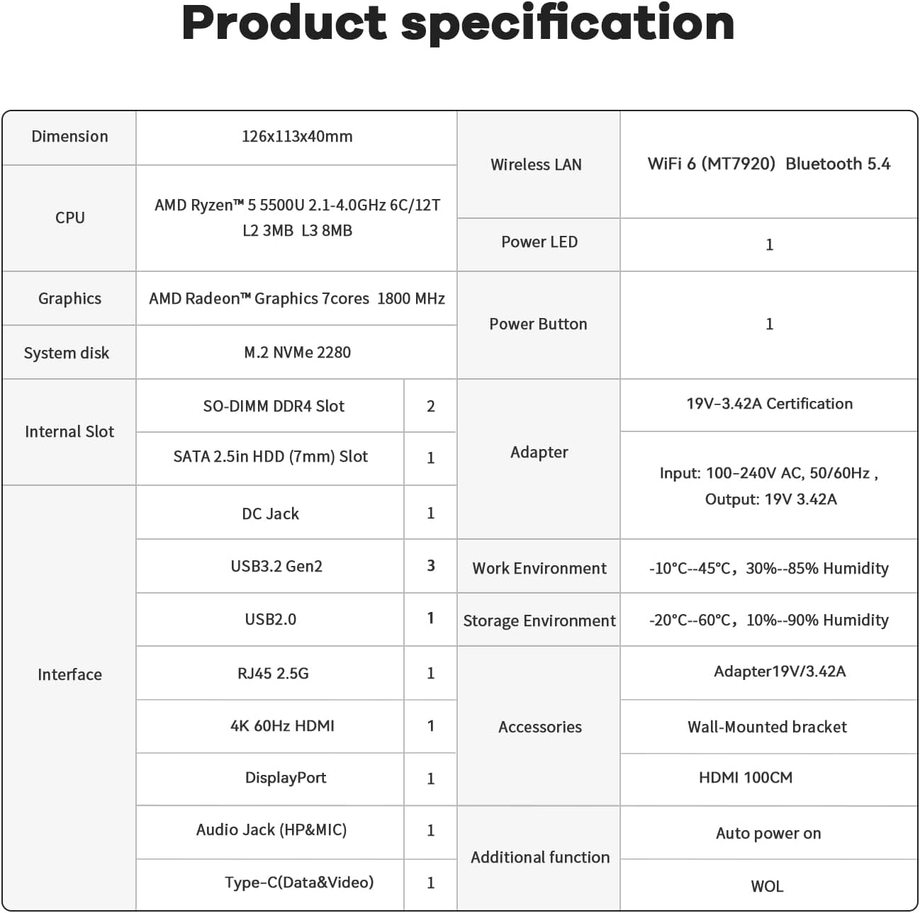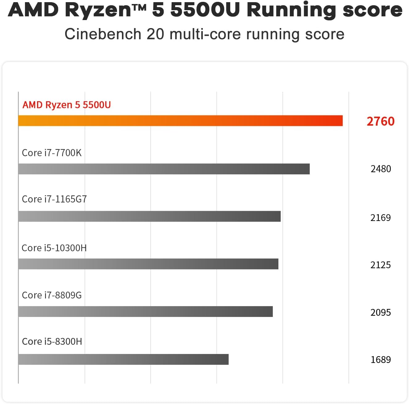 • 【Превъзходен хардуер】: Оборудван с AMD Ryzen 5 5500U, базова честота 2.1 GHz, максимална турбо честота 4.0 GHz, 8MB L3 кеш. С 6 ядра и 12 нишки, той предлага по-мощна цялостна производителност, позволява по-голяма продуктивност, реагира бързо на многозадачност и отговаря на нуждите на различни приложения като работа, забавление и игри.