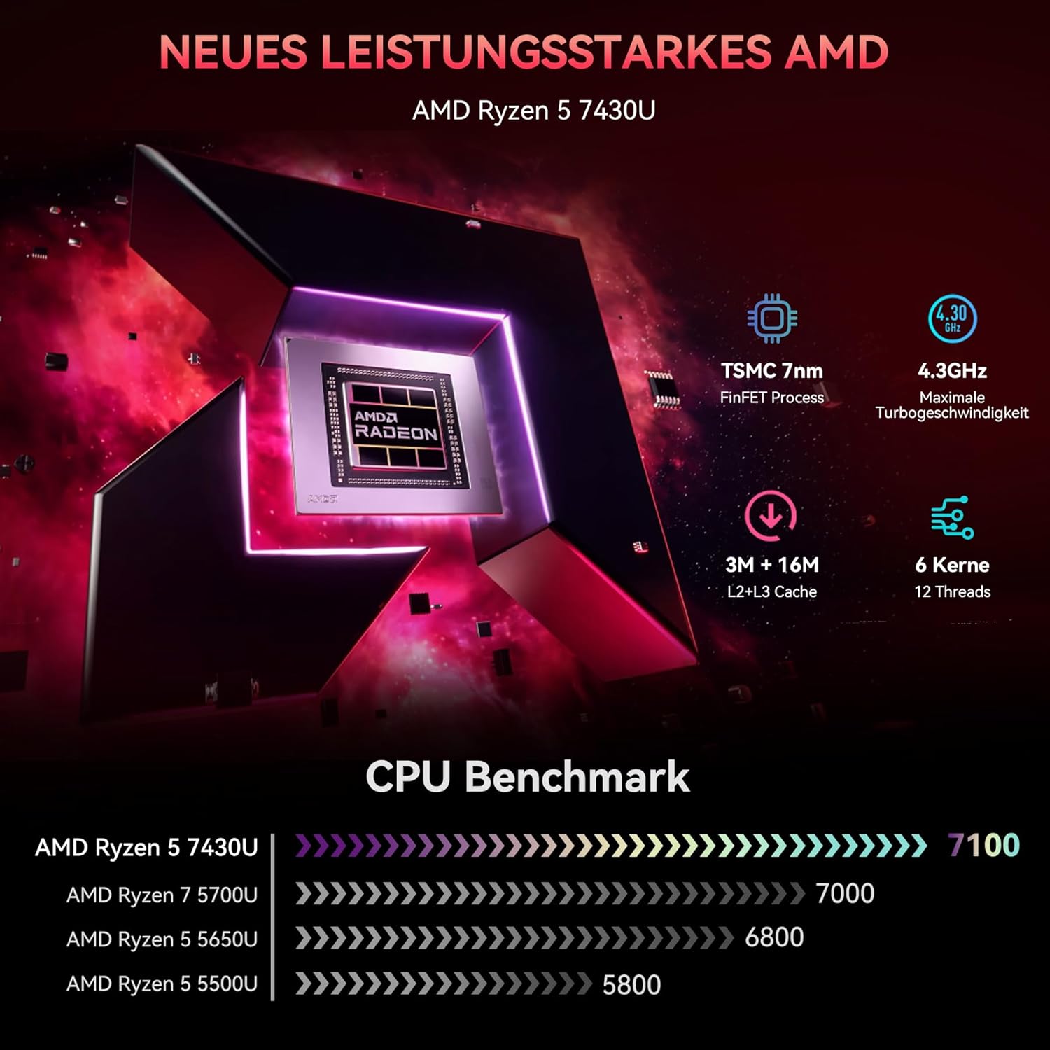 • 【Мощен AMD Ryzen 5 7430U】 Многозадачност с максимална производителност: Мини компютърът MP100 е оборудван с AMD Ryzen 5 7430U – 6 ядра, 12 нишки, до 4.3GHz. Идеален за многозадачност, офис работа, програмиране или редактиране на медийни файлове. Въпреки компактния си размер, той предлага настолен компютър с енергийно ефективен 15W TDP. Перфектен за професионалисти, студенти и креативни потребители, които се нуждаят от надеждна производителност във всяка ситуация.