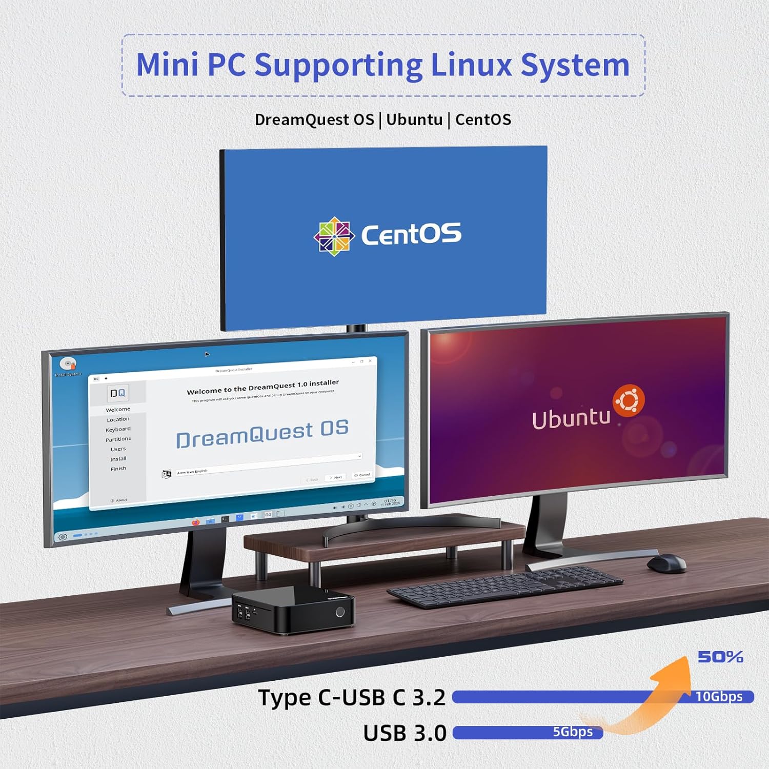 Мини компютър DreamQuest с Linux, предварително вграден процесор Intel N150 с 16GB DDR4 + 512GB M.2 SSD, поддръжка на три екрана, 4K@60Hz дисплей, 2X HDMI, DP, USB C 3.2 x1, двоен WiFi, BT 5, LAN, мини офис компютър