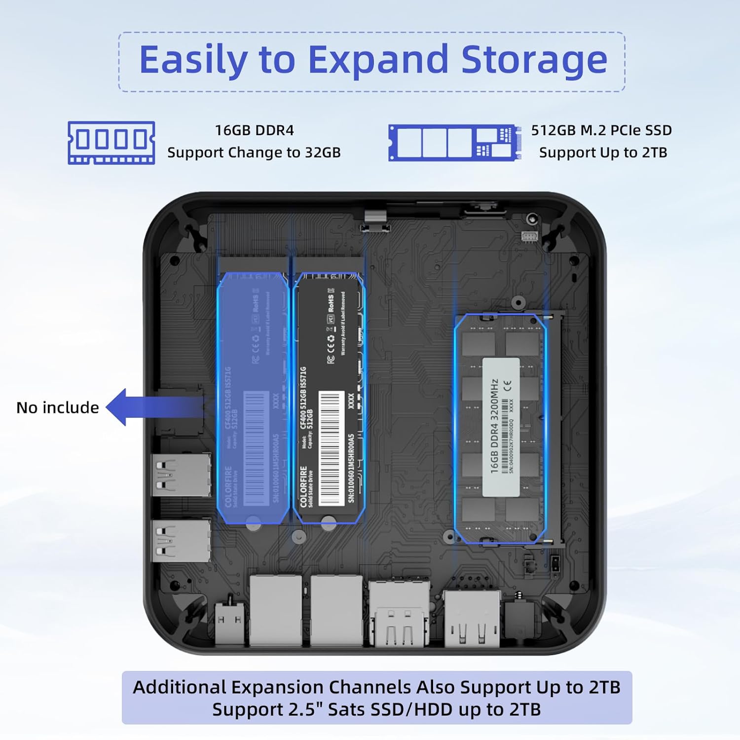 • ???? 【????????????????????????????????????????????????】 Мини компютърът DreamQuest е съвместим с 512GB M.2 2280 SSD. Това устройство може да бъде надстроено до 2TB в един канал и има 2 канала. Общият максимален капацитет за надграждане е 4TB (не е включен). Освен това, може да се добави 2.5" SATA SSD/HDD до 4TB.