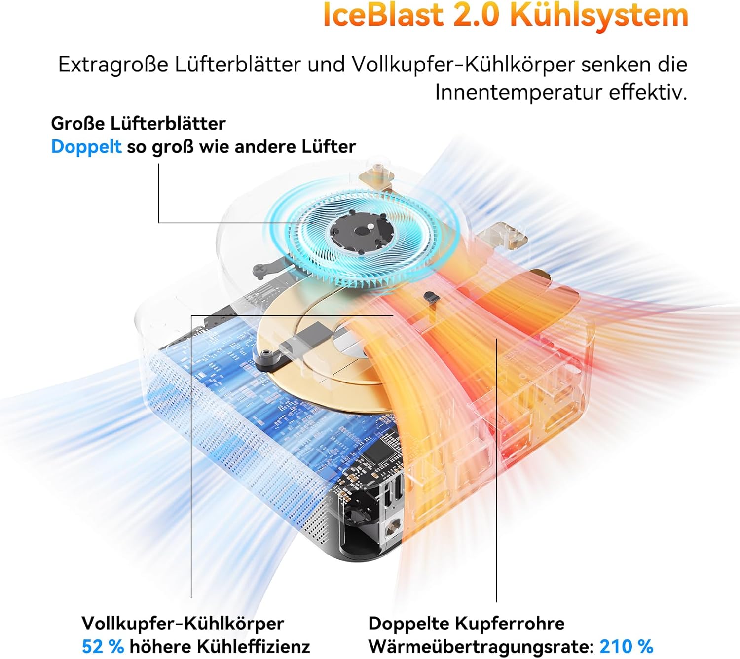 • Усъвършенствано охлаждане за максимална производителност - Мини компютърът A6 е оборудван с технологията за охлаждане IceBlast на GEEKOM, която осигурява ефективност дори при големи натоварвания. Иновативният дизайн на въздушния поток и задният вентилационен отвор поддържат системата хладна и тиха, осигурявайки оптимална производителност за взискателни задачи като игри или редактиране на видео, без обезпокоителен шум или прегряване.