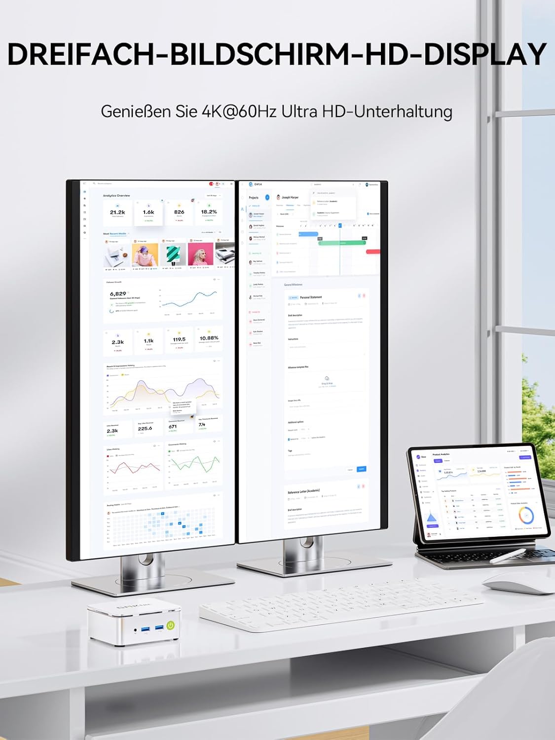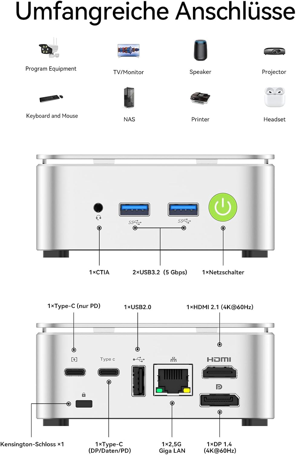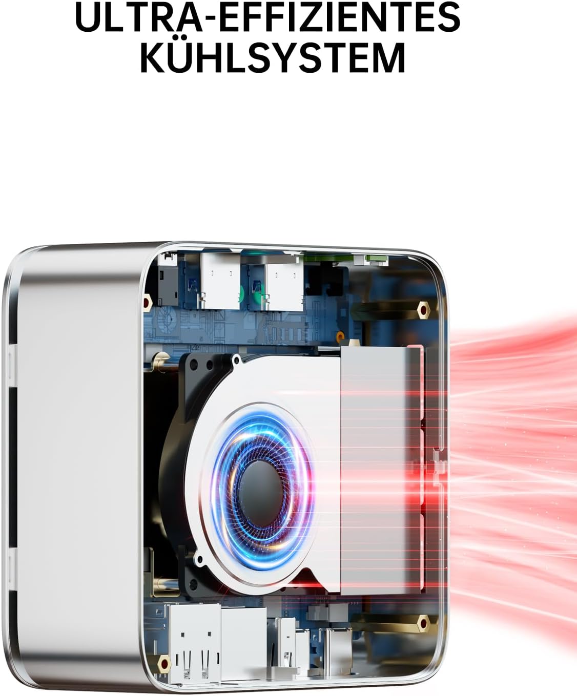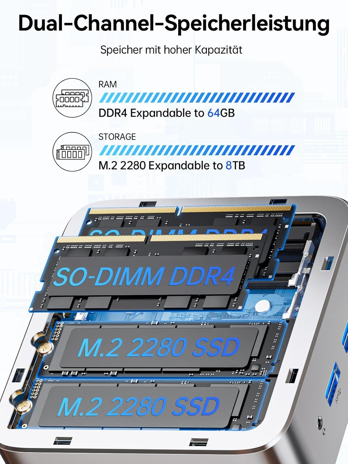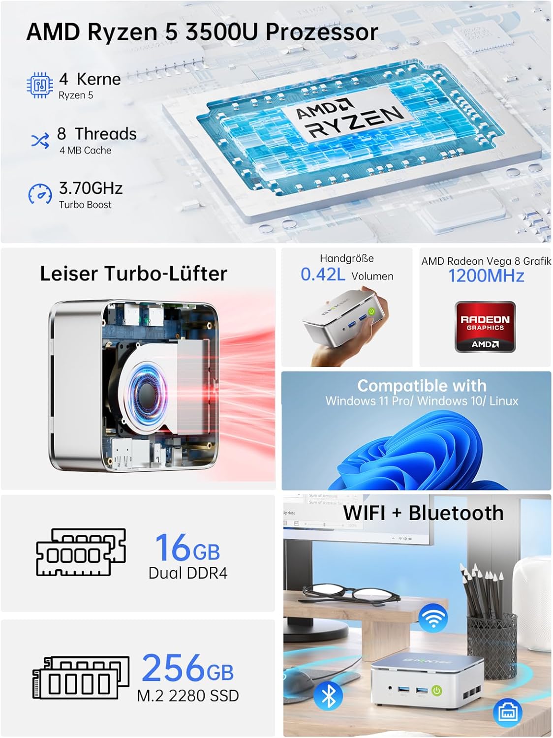 • Мини настолен компютър с три дисплея – С графичен процесор AMD Radeon Vega 8 (1200 MHz) за мощна графична производителност, идеален за редактиране на видео, стрийминг или небрежни игри. Поддържа едновременно свързване на три дисплея чрез HDMI 2.1 TMDS, DisplayPort 1.4 и USB-C.