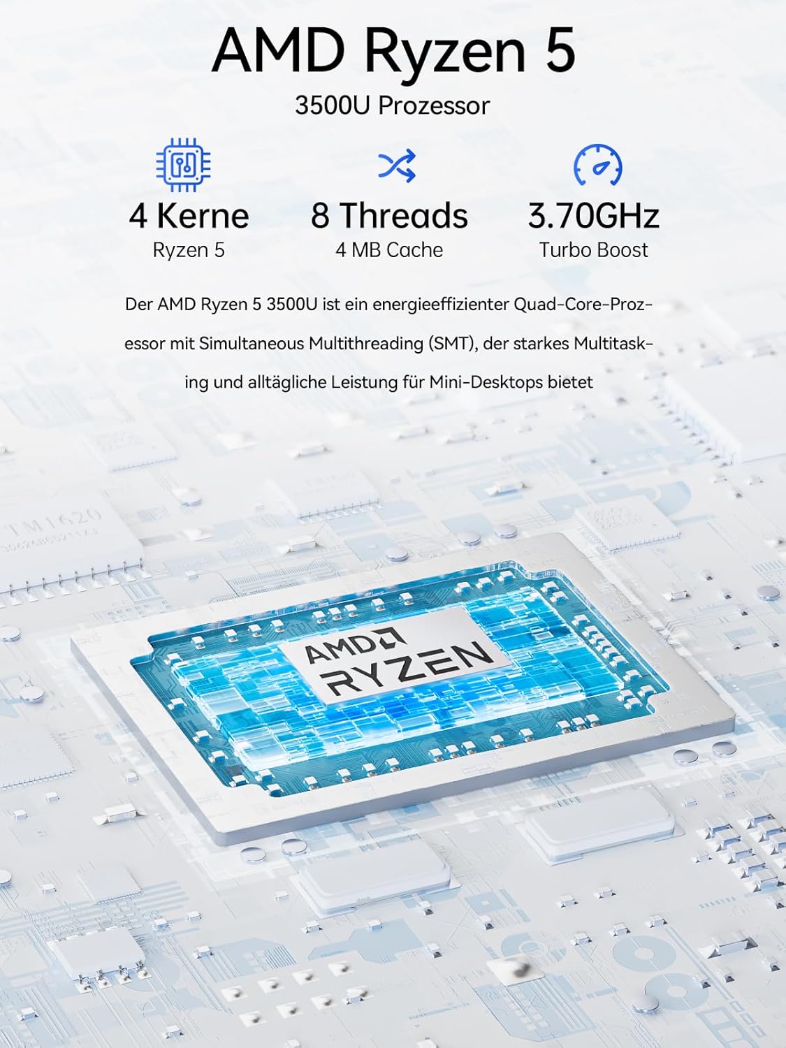 • МИНИ КОМПЮТЪР ЗА ОФИС И ЛЕКИ ГЕЙМИНГИ – Серията GMKtec Nucbox G10 е оборудвана с Ryzen 5 3500U, 64-битов четириядрен мобилен процесор от среден клас, базиран на микроархитектурата AMD Zen+, използващ 12nm процес. 3500U работи на базова честота от 2,1 GHz (TDP 15W) и boost честота до 3,7 GHz. Поддържа до 32 GB двуканална DDR4-2400 RAM памет и интегрира графика Radeon Vega 8 (1,2 GHz). Той осигурява 35% подобрение в производителността в сравнение с Intel N150/N100/N97/N95.