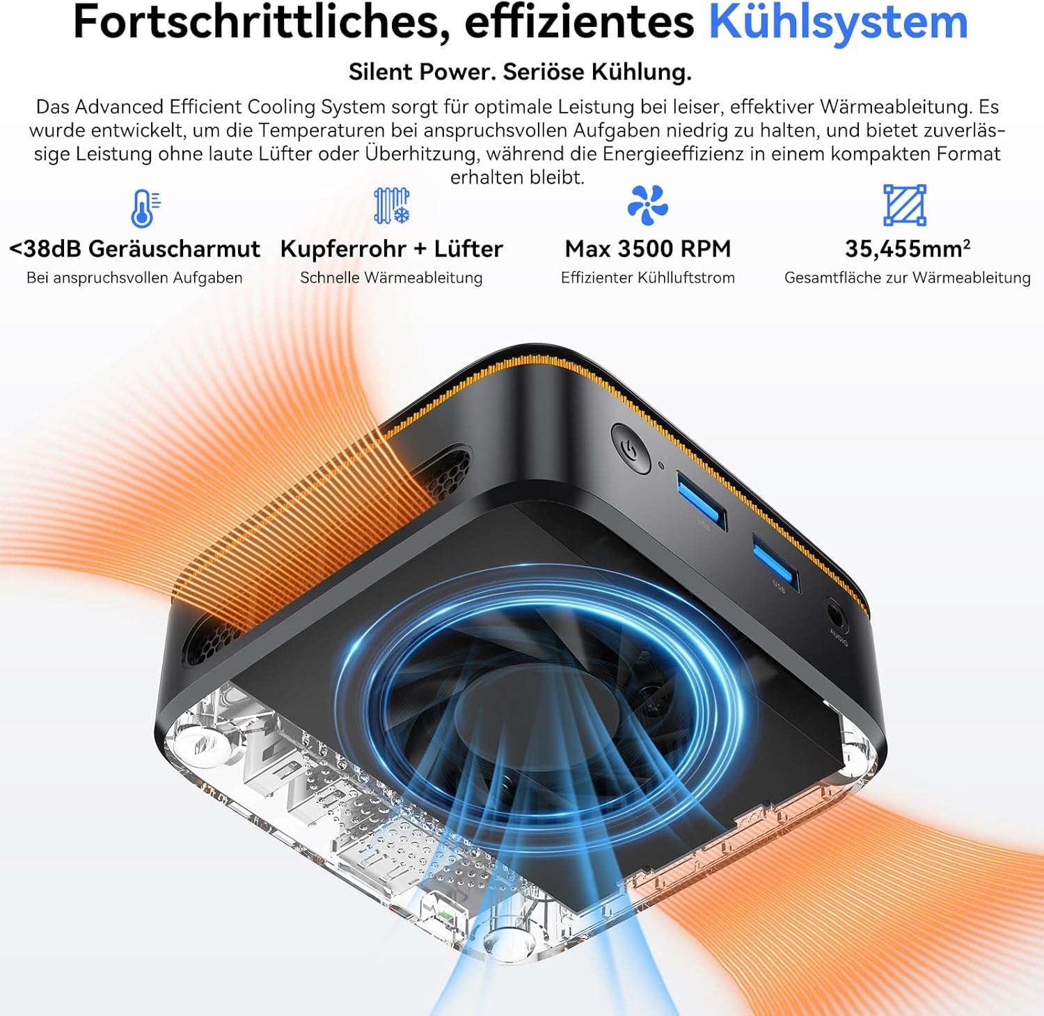 • 【16GB RAM + 512GB SSD – Моментална реакция】Комбинацията от 16GB RAM и 512GB SSD гарантира на мини компютъра безпроблемно потребителско изживяване със стартиране за секунди и светкавично бързо зареждане на приложенията, докато моделите с 8GB RAM или eMMC памет изпитват значително влошаване на производителността по време на многозадачност – особено при превключване между браузъри, офис пакети и медийни плейъри.