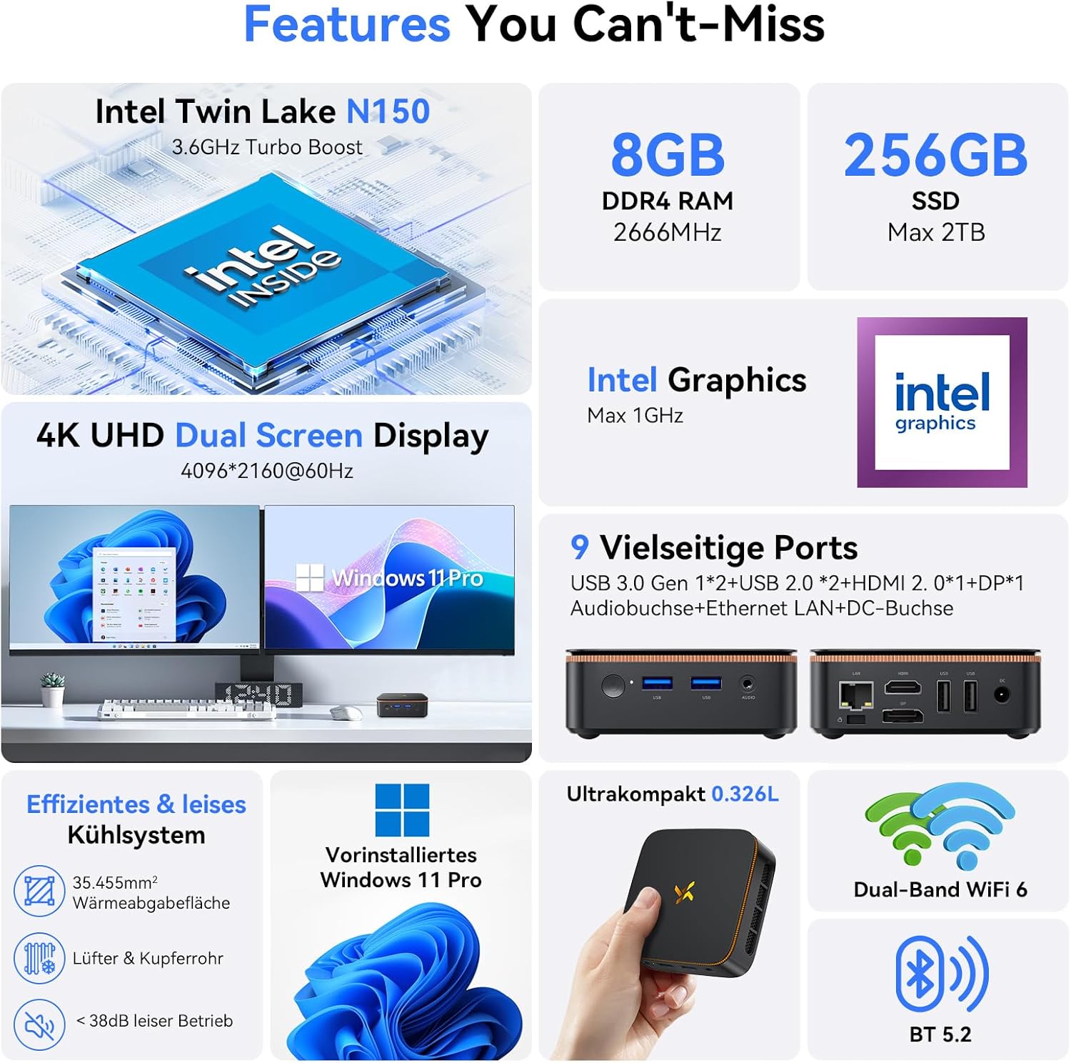 Мини компютър Huidun H50 W-11 Pro, Intel Twin Lake N150 (ъпгрейд на N97/N100), 8GB RAM 256GB SSD, мини компютър, 4K @ 60Hz UHD, WiFi 6, BT 5.2, USB/HDMI/DP за бизнес/домашно кино