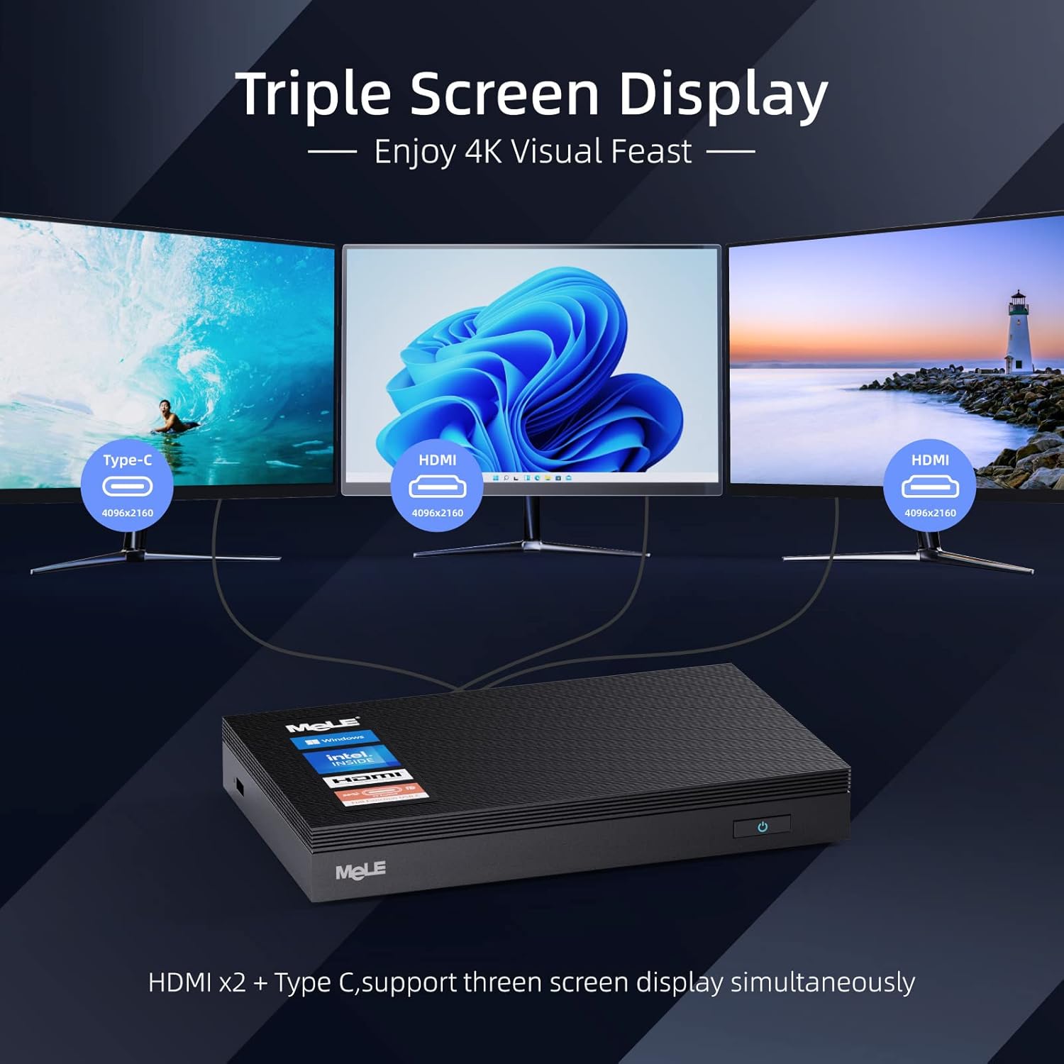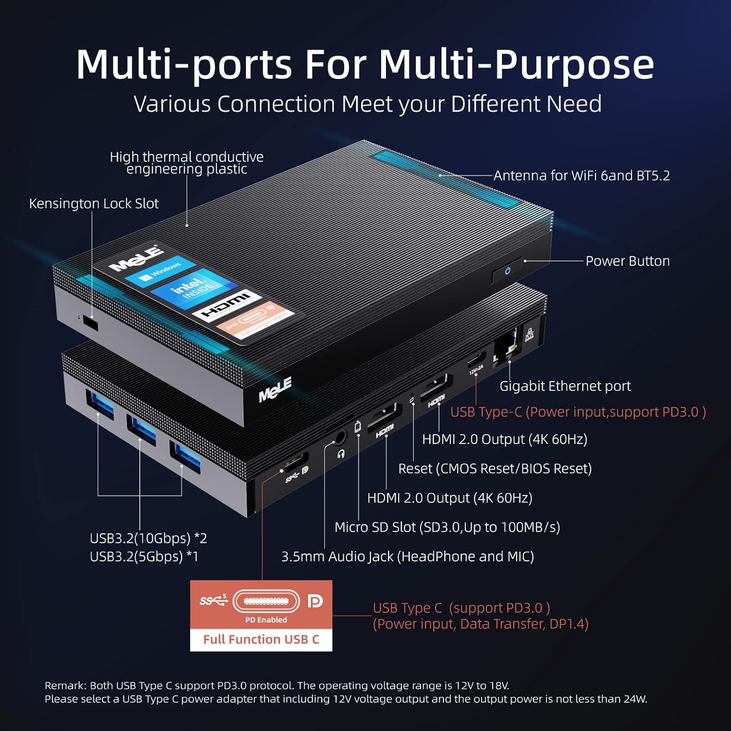 • 【Напълно функционален USB-C, PD 3.0 захранване】Мини компютърът MeLE е оборудван с напълно функционален USB-C порт, който поддържа възпроизвеждане на 4K видео, пренос на данни и захранване. С технологията PD 3.0, мини компютърът може да се зарежда от различни източници на захранване (12V-23V, 24W+), което ви позволява да се наслаждавате на удобството да използвате преносимия настолен компютър навсякъде и по всяко време.